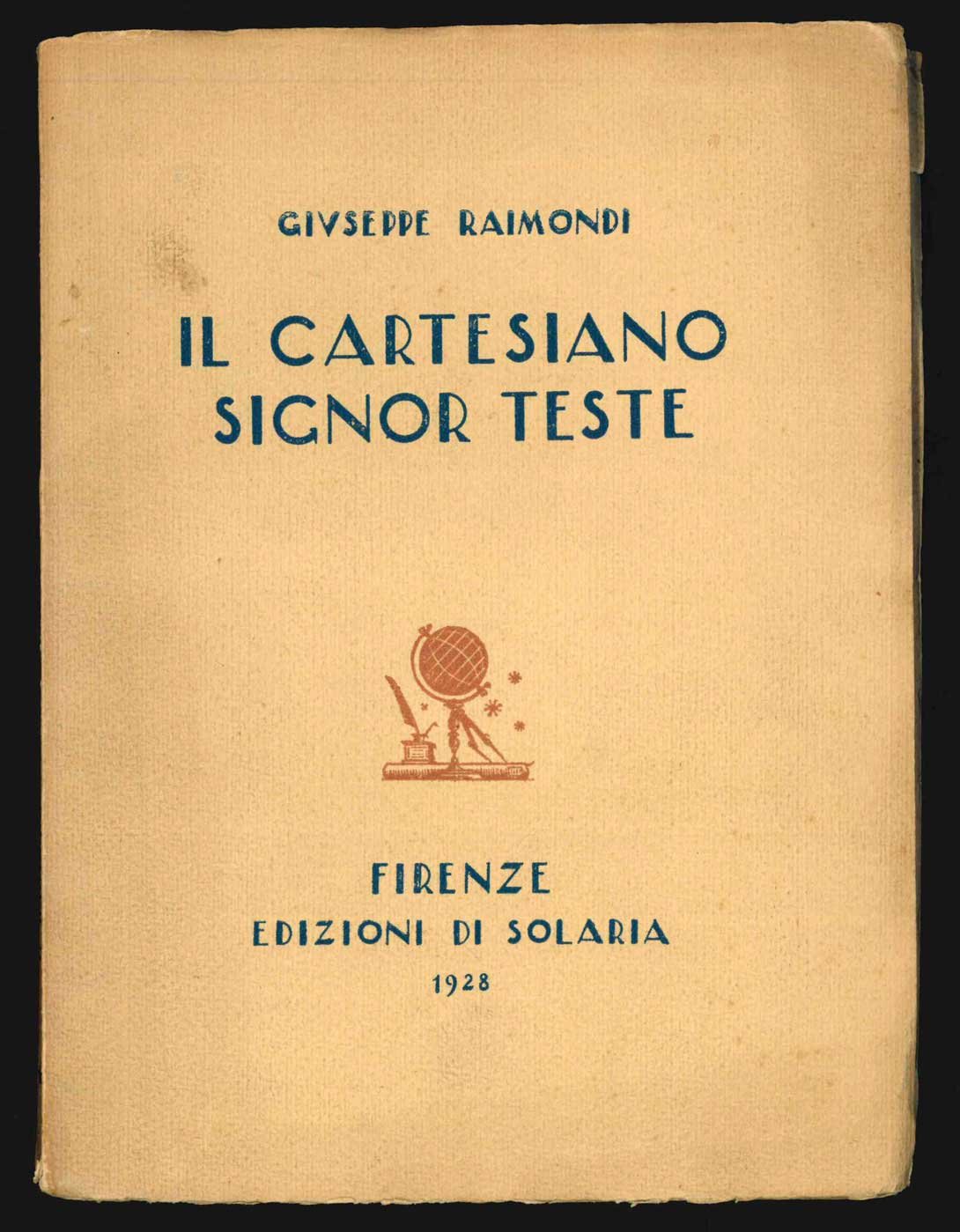 LIBROEdizione originale.Esemplare numero 287 (di 420), in ottime condizioni (normale uniforme brunitura), a fogli ancora chiusi; pecetta editoriale in quarta di copertina a coprire il prezzo e aggiornarlo dalle originali «L. 7» a «L. 40».Brillante operetta a metà tra il saggio e l’esercizio letterario, dedicata al Valéry di «La soirée avec monsieur Teste». Inusualmente per le edizioni di «Solaria», la copertina presenta un design a due colori impreziosito da una piccola illustrazione, non firmata ma di Bruno Bramanti, che parve non piacque all’autore — da cui l’esistenza di copie con la classica grafica di copertina «Solaria». Fu Raimondi, naturalmente, a volere il disegno di Leo Longanesi stampato in antiporta e raffigurante il «Colloquio notturno del Signor Edmondo Teste e di Renato Cartesio».
