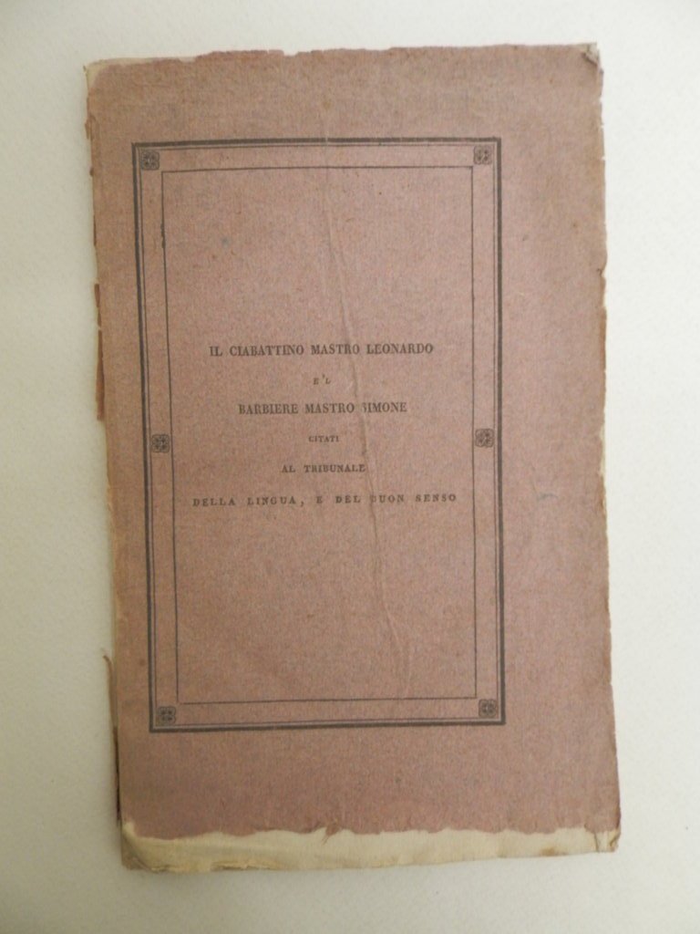 16^, pp. 54, brossura editoriale rosa con mancanza al dorso e slegatura dei fascicoli, facilmente restaurabile, nel complesso buona copia internamente fresca e in barbe. Sulla scia del noto vocabolario italiano-piemontese di Michele Ponza, apparvero nell'anno 1831 tre opuscoli tanto rari quanto interessanti e polemici: l'unico ad avere paternità sicura è: Lo staffile di Don Ponza. Diatriba di Marforio Strofini in forma di dialogo tra Mastro Simone Barbiere, Mastro Leonardo Ciabattino ed altri interlocutori. Degli altri due, uno è citato da Melzi (p. 75): Osservazioni di mastro Leonardo ciabattino sopra il vocabolario piemontese-italiano di Michele Ponza. L'altro, il nostro è probabilmente la risposta al precedente. Assente nel Melzi, reca al fondo uno scritto di Cesare Pezza all'Annotatore Piemontese, rivista letteraria diretta proprio da Michele Ponza.. *** TUTTI I NOSTRI LIBRI SONO VISIBILI PREVIO CONTATTO MAIL O TELEFONO NELLA NUOVA SEDE DI MILANO: LIBRERIA COSMOPOLIS, VIA JOMMELLI, 22. ***