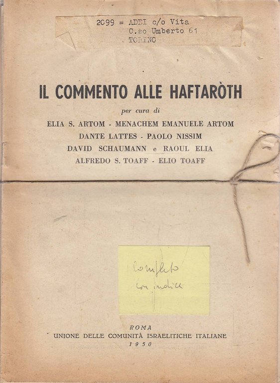 Elia S. Artom, Menachem E. Artom Dante Lattes, Paolo Nissim, Dav, Id Schaumann, Raoul Elia, Alfredo S. Toaff, Elio Toaff (A Cura)