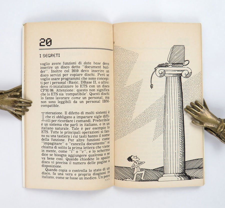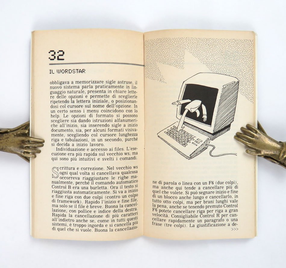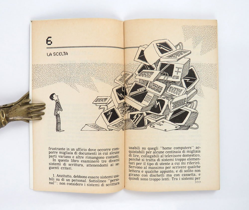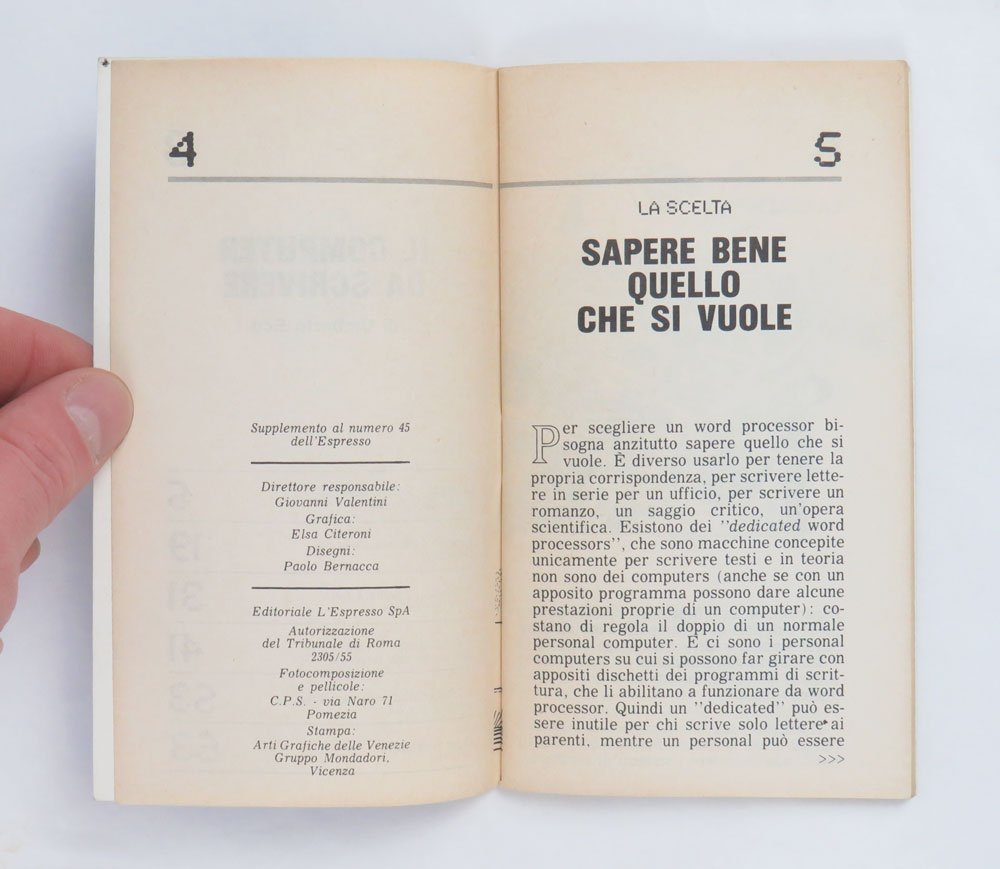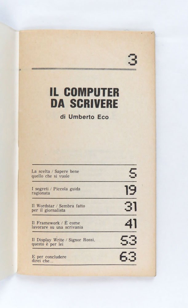 LIBROEdizione originale.Ottimo esemplare (lievissime tracce di frizione da scaffale sulla copertina).Rarissimo opuscolo “taschinabile” allegato al numero 45 dell’«Espresso» della prima settimana di novembre 1985: i testi di un Eco in forma smagliante dialogano con le illustrazioni di Paolo Bernacca. Francesco Guglieri ci ha scritto sopra un gran bell’articolo pubblicato su «Domani» del primo luglio 2022, che comincia così: «Ho ritrovato questa chicca deliziosa: un librino dell’86 [sic: ma è 1985] in cui Umberto Eco consigliava quale programma di scrittura usare. A metà tra recensione, manuale, guida all’acquisto. Un Eco “über nerd” che scrive di quanti “tocchi” devi fare per salvare un file, l’usabilità dei menù, quanti dischetti servano per salvare un testo e come. Una finestra sugli albori dell’informatica personale, e sulla distanza da come oggi ci rapportiamo alla tecnologia». -- Eco nel 1977 aveva pubblicato il fondamentale saggio/manuale «Come scrivere una tesi di laurea» — continuamente ristampato da Bompiani per tutti gli anni ottanta e seguenti — e nel 1986, l’anno appena successivo al 1985 di questo opuscolo, firmerà la prefazione al libro di Claudio Pozzoli che rilanciava il suo del 1977: «Come scrivere una tesi di laurea con il personal computer» (BUR Rizzoli). C’è molta confusione online e in letteratura sulla data effettiva di questo opuscolo, non riportata sullo stesso: capita di leggere sia 1981 (ICCU e molte biblioteche anche all’estero) che 1986 (Guglieri cit.ma anche E. Carbé, Digitale d’autore, USiena Press, 2023), ma l’unica occorrenza del titolo è nell’annata 1985 dell’«Espresso», il cui quarantacinquesimo fascicolo data alla settimana del 4 novembre. 1985 è del resto confermato dalla bibliografia di Umberto Eco curata da James Contursi.Bibl. Contursi, Umberto Eco: An Annotated Bibliography, n. Aa17.
