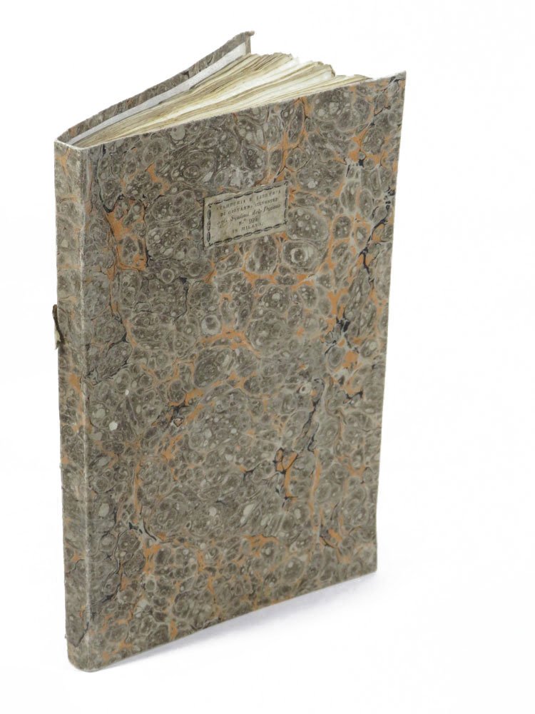 - legatura coeva in cartonato a marmorizzatura marrone chiaro con venature aranciate e nere, etichetta al piatto anteriore: «Stamperia e libreria di Giovanni Silvestri ‘agli Scalini del Duomo’ n.° 994 in Milano»,