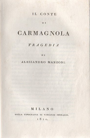 LIBROEdizione originale, primo tiratura.Bell’esemplare in cartonato coevo, con barbe (235 x 150 mm), e nel primo stato della tiratura con il refuso «era il pensiero | che il valor» a p. 62/63 (successivamente emendato in «. del valor»).La prima tragedia di Manzoni, con l’importante prefazione autoriale sul coro, il celebre «cantuccio» riservato all’opinione dell’autore, dove cita un ampio brano della terza lezione del «Corso di letteratura drammatica» di Schlegel. Ai drammi storici della scuola romantica tedesca si ispira infatti l’opera con la quale l’autore risponde alle istanze di rinnovamento che animavano il panorama milanese del tempo e di cui “Il Conciliatore”, chiuso nel 1819 dalla censura austriaca, si era fatto portavoce. Proprio alle simpatie di Manzoni per il periodico sono da attribuire le vicissitudini editoriali che portarono alla stampa della tragedia: il primo incaricato, Giulio Ferrario, funzionario imperiale nonché bibliotecario di Brera, rinunciò al lavoro per affidarlo al fratello Vincenzo, già stampatore del “Conciliatore” e vicino agli ambienti romantici.Bibl.: Parenti, Rarità, I, pp. 173 e seguenti