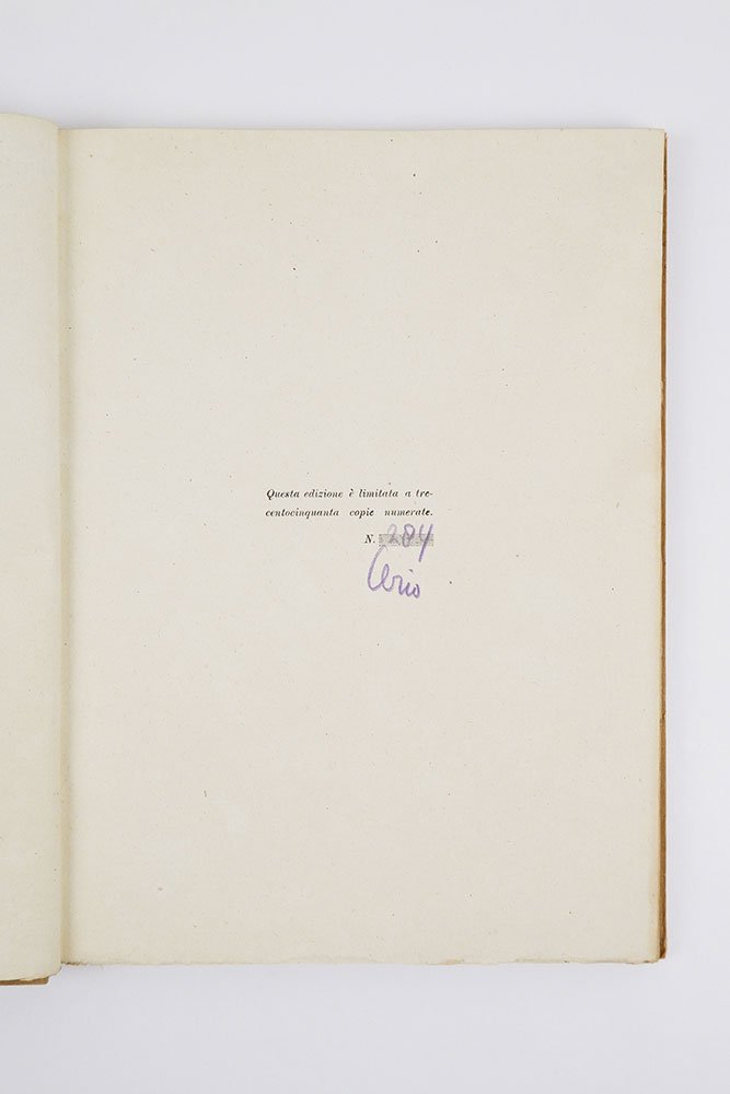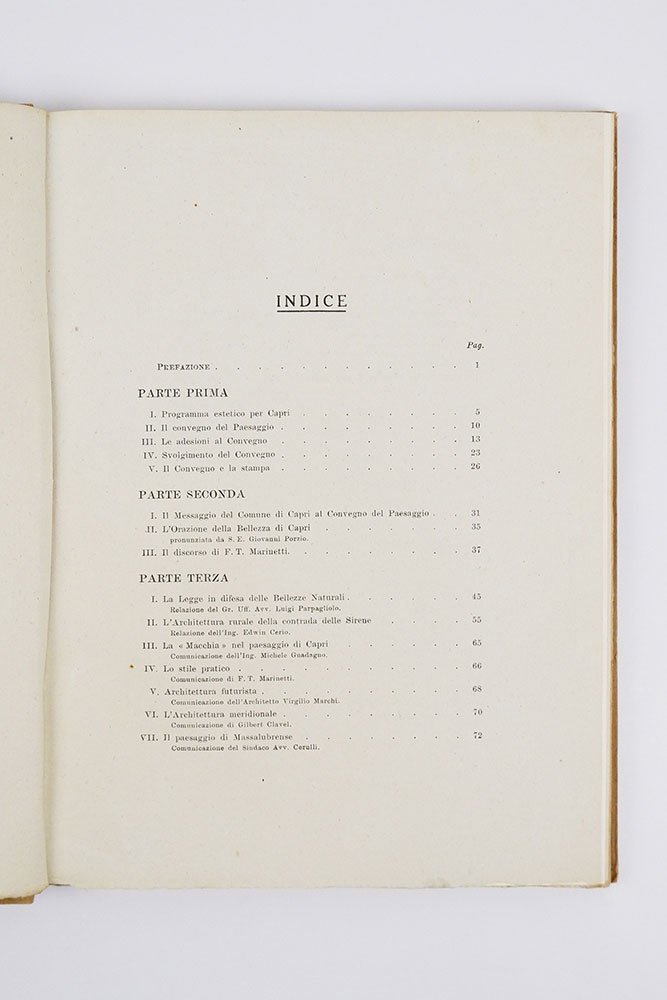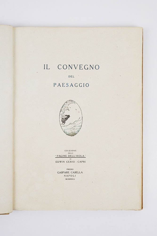 LIBROEdizione originale.CON AUTOGRAFO.Esemplare numero 284/350, in eccellenti condizioni di conservazione, freschissimo, pulito e intatto alla copertina: rarissimo così. Numero manoscritto seguito da firma autografa di Edwin Cerio.A compimento dell’intensa stagione primonovecentesca di Capri — e apice della sindacatura triennale di Edwin Cerio — si colloca il «Convegno del paesaggio», 9-10 luglio 1922. In giugno era stata finalmente approvata, dopo un iter di quasi due anni, la cosiddetta legge Croce per la tutela del paesaggio, la prima in Italia: tra i principali promotori vi erano due dei partecipanti al convegno, l’onorevole Giovanni Rosadi (già fautore della prima legge sulla tutela del patrimonio storico e artistico, del 1909, detta Rava-Rosadi) e Luigi Parpagliolo, per una vita alla Direzione delle Antichità e Belle arti. Accanto ai politici, Cerio — che era uno «scintillante e versatile uomo di talento» (Piscopo, p. 14) — chiama al convegno i futuristi: Italo Tavolato, che lancia, in stile futurista, un vero e proprio «Manifesto della bellezza di Capri»; Filippo Tommaso Marinetti che non solo tiene una relazione (Lo stile pratico) ma è incaricato di fare letteralmente da controcanto — «dopo tanti oratori, vi sembrerò un poco terra terra» — in apertura dei lavori; l’esponente di punta dell’architettura futurista nel corso degli anni ’20, Virgilio Marchi (Architettura futurista); e per chiudere lo stravagante intellettuale svizzero Gilbert Clavel (L’architettura meridionale). «Tra i contributi al convegno quello dell’ideologo del futurismo, Filippo Tommaso Marinetti che con fare più propositivo che provocatorio propone di difendere l’isola dal falso antico e dal commercialismo artistico, e quello dell’architetto futurista Virgilio Marchi, che sottolinea la possibilità di un’espressione radicalmente moderna ma sensibile ai contesti. Il convegno ha una vasta eco sulla più diffusa rivista nazionale di settore, “Architettura e arti decorative”» (Mangone, p. 250-s). -- La pubblicazione degli atti del convegno avvenne sotto le insegne delle «Pagine dell’Isola», prima rivista poi collana editoriale diretta da Edwin Cerio: ne nacque un libro di rara sobrietà e bellezza tipografica, stampato su carta Amalfi in barbe e ornato da scelte illustrazioni. I testi qui compresi sono tutti in edizione originale e unica.Bibl.: Cammarota, Futurismo, VI.28; Sandomenico, Leggere Capri, p. 111 (con imprecisioni); Piscopo, Capri futurista (Napoli 2001); Mangone, L’isola dell’architettura (in: Architettura e paesaggi della villeggiatura, Milano 2015, pp. 237–255)