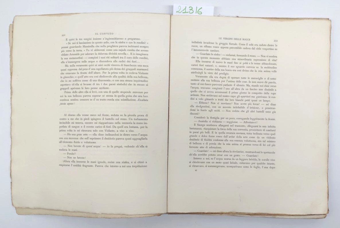 storica rivista fondata e diretta da Adolfo De Bosis, fra le più importanti della cultura italiana a cavallo tra Otto- e Novecento brossura originale disegnata da Giuseppe Cellini con elaborati motivi ornamentali e floreali incisi in xilografia. Ogni fascicolo è illustrato con belle tavole riprodotte in fotoincisione f.t. e n.t. di artisti come Giuseppe Cellini, Giulio Aristide Sartorio, Francesco Paolo Michetti, Alessandro Morani, Lawrence Alma-Tadema, Elihu Vedder, Enrico Coleman, ecc. La rivista, pubblicata da De Bosis a proprie spese, fu il tipico frutto dell'estetismo decadente fin de siècle (con echi ancora palpabili del gusto preraffaellita) e adunò alcuni dei maggiori nomi delle lettere italiane del tempo, D'Annunzio in testa a tutti. Una sorta di positivismo da superuomo, mescolato di spirito libertario e al tempo stesso imperialista, antipacifista, anima e arricchisce i bellissimi fascicoli, dai fregi alessandrini e dai grandi margini. È questo il momento più singolare del nostro decadentismo. e nel Convito che si riconosce il grado artistico del parnassianesimo italiano (Giorgio Petrocchi)