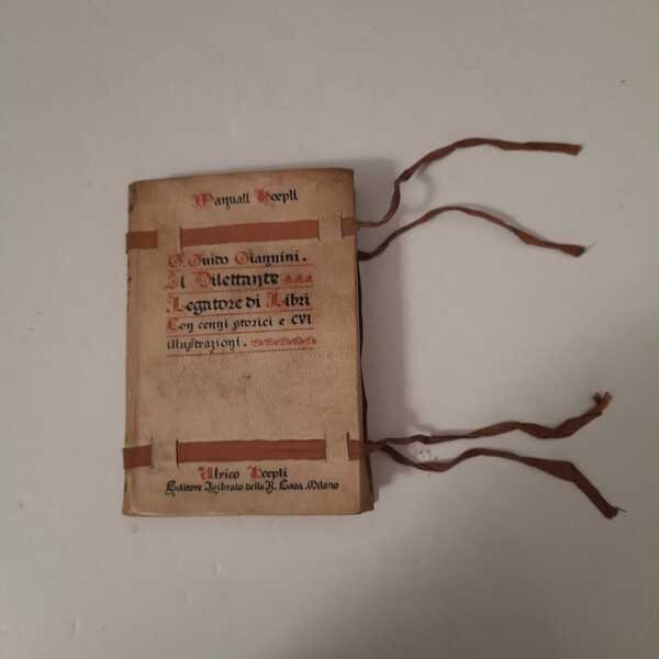 Volume in 16° Legatura editoriale in pelle bianca (pergamena ?) nastro in cotone piatto che attraversa il volume per chiuderlo.