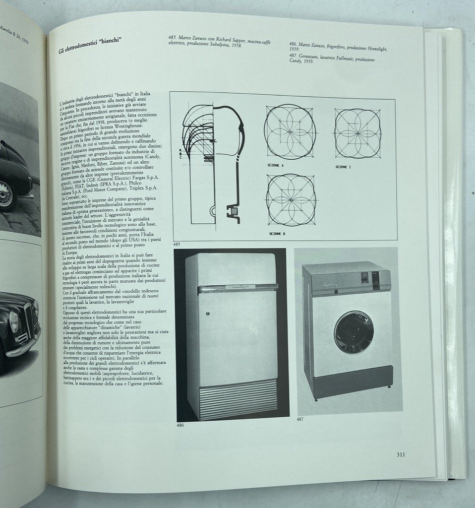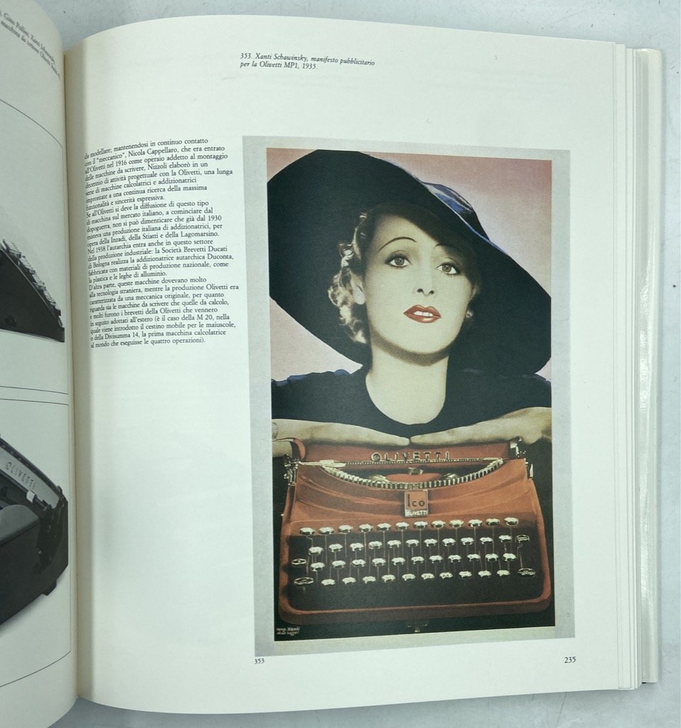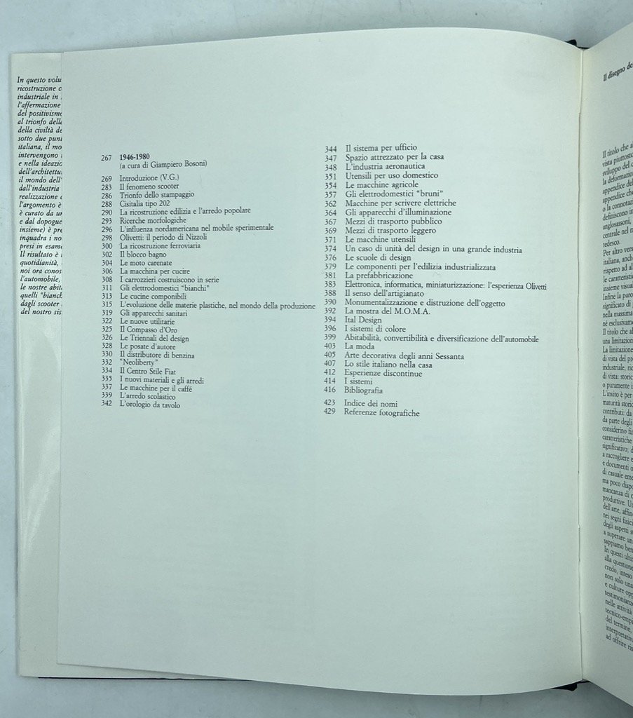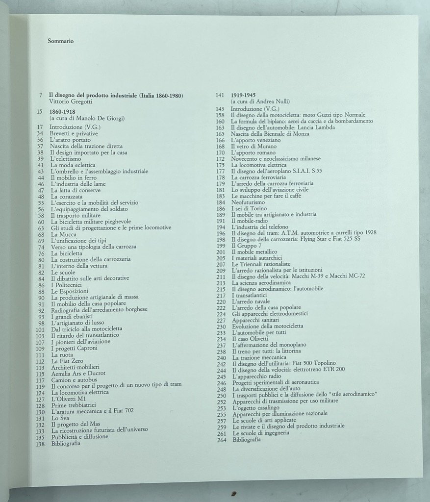 Legatura editoriale in tela rigida con sovraccoperta e cofanetto illustrati, cm 29 x 26, pp 429 (3) con 716 illustrazioni, alcune delle quali a colori. Leggermente scolorito il dorso, in ottimo stato internamente. Importante studio sulla storia della cultura progettuale italiana, l'intrecciarsi del Movimento Moderno e delle avanguardie con i mutamenti economici e industriali, l'affermazione della civiltà delle macchine. Il volume è curato da Vittorio Gregotti e si compone di tre sezioni dedicate ad altrettanti archi cronologici: 1860-1918, a cura di Manolo de Giorgi, 1919-1945, a cura di Andrea Nalli, e 1946-1980, a cura di Giampiero Bosoni. L'opera di designer, centri studi e aziende, le mostre più significative, i prodotti più iconici sono presentati ed analizzati attraverso immagini e note critiche. Efficacissimo il progetto grafico della copertina, di Pierluigi Cerri, che mostra una calcolatrice Olivetti Divisumma 24 sul cofanetto e lo stesso oggetto privato del guscio sulla sovraccoperta.