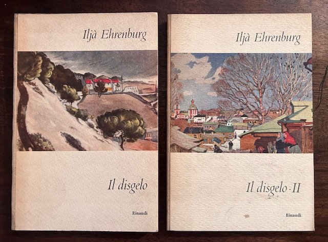 2 voll. in-8°, pp. 205,(7); 186,(4), cartonature editoriali illustrate. I Coralli 65 - 77. Il disgelo, è la trasposizione in termini di romanzo di una particolare fase di sviluppo della società sovietica, in cui nuovi problemi e nuove esigenze s'impongono alla coscienza di ognuno, spezzando schemi e dogmi falsi e invecchiati. Il titolo di questo libro venne poi universalmente adottato per designare il processo storico seguito alla morte di Stalin e culminato col rapporto Krusciov al XX Congresso