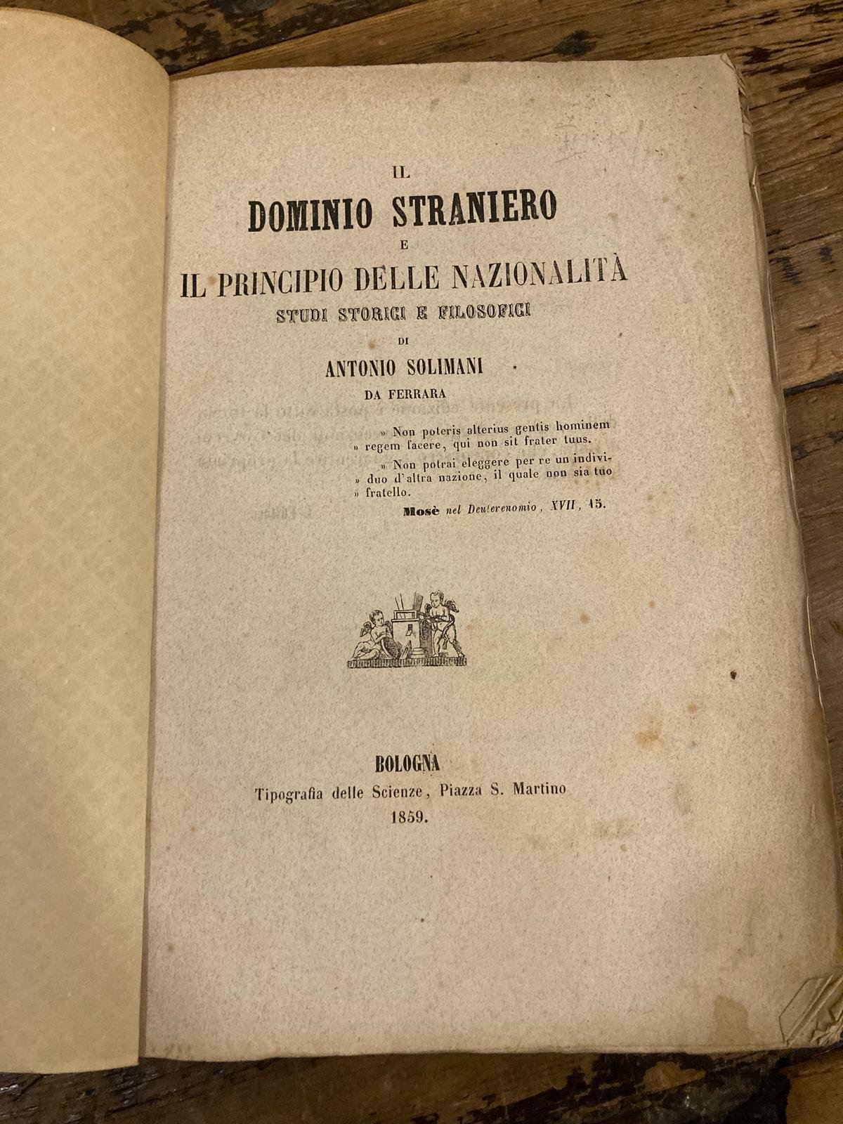 In-8° (22x16 cm), pp. 304 (4), brossura in carta decorata muta novecentesca. Più che buon esemplare completo di ultima pagina di errata. Edizione originale di questa raccolta di saggi dello studioso libero docente di filosofia del diritto ed economia politica all'Università di Ferrara. Nella prima parte della trattazione vengono esaminati svariati casi di dominio straniero dai tempi della sottomissione romana della Grecia, la Giudea sotto la Siria, la Spagna sotto gli Arabi, i Normanni in Inghilterra, l'Italia e Federigo Barbarossa fino a giungere al Lombardo-Veneto sotto il governo austriaco. Nella seconda parte si analizzano i caratteri esterni e interni che limitano e distinguono le nazioni; Il governo straniero involve un'intrinseca; In un'era civile niun fatto può legittimare il dominio straniero: la conquista a forza, gl'interventi, le chiamate, i congressi; la prescrizione; indipendenza municipale; autorità ecclesiastiche e profane.