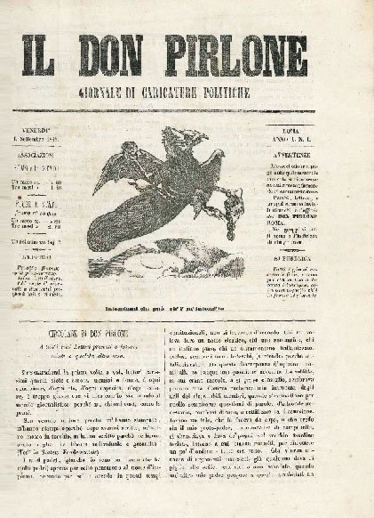 PERIODICOCollezione completa.Tutto il pubblicato, dal n. 1 del 4 settembre 1848 al n. 233 (erroneamente segnato 234) del 2 luglio 1849. Pubblicato durante la rivoluzione romana, il Don Pirlone, quotidiano di taglio satirico, ebbe un enorme successo. In copertina, il motto “Intendami chi può, ch’i m’intend’io” è una dichiarazione d’intenti contro l’ipocrisia, così come la caricatura del benpensante disegnata da Gigli a Siena nel 1711. Le 234 belle tavole litografiche (anche a piena pagina) sono anonime, per evitare di esporre i disegnatori ad inchieste e persecuzioni. Nonostante l’opposizione dell’allora ministro dell’Interno del Governo pontificio, il Don Pirlone non cessò le pubblicazioni, e anzi, con la proclamazione della Repubblica Romana nel febbraio del 1849, seguì da vicino lo sviluppo delle turbolente vicende politiche del periodo, sempre con una vena satirica e irriverente. Il 2 luglio 1849 si stampò l’ultimo numero, e il giorno successivo le truppe francesi entrarono a Roma.