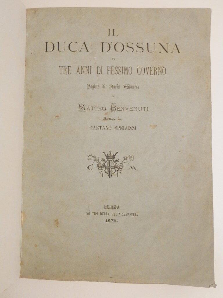 in folio, 36 cm, pp. 295, illustrazioni di Gaetano Speluzzi nel testo, rilegatura coeva in piena pergamena rigida, titolo in oro su tassello al dorso, conserva le brossure originali, esemplare molto buono. Edizione numerata n. 53 di 300 esemplari. Storia del governo di Milano da parte del duca d'Ossuna (1670 - 1674). *** TUTTI I NOSTRI LIBRI SONO VISIBILI PREVIO CONTATTO MAIL O TELEFONO NELLA NUOVA SEDE DI MILANO: LIBRERIA COSMOPOLIS, VIA JOMMELLI, 22. ***