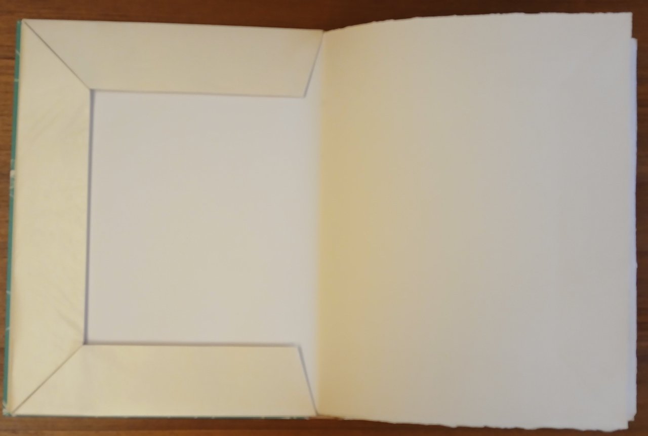 In 4° (cm 32,5 x 25), custodia rigida in cartone e cartella con titolo in oro su dorso in simil pergamena, ornate da carta verde con motivi floreali bianchi su disegno di Manzù,