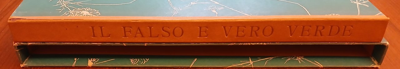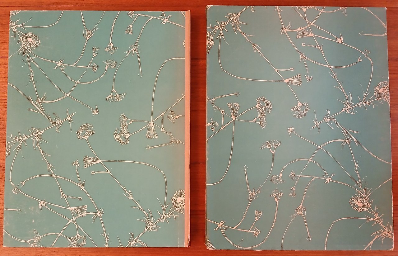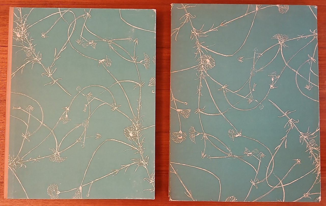 - In 4° (cm 32,5 x 25), custodia rigida in cartone e cartella con titolo in oro su dorso in simil pergamena, ornate da carta verde con motivi floreali bianchi su disegno di Manzù, all’interno brossura in camicia con protezione in carta pergamino