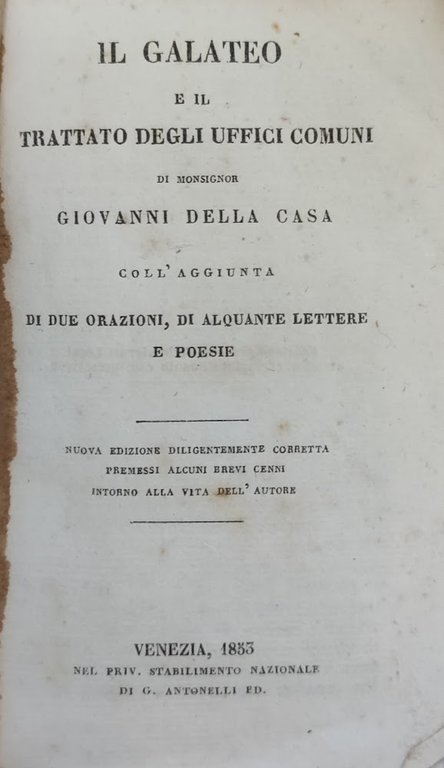 IL GALATEO E IL TRATTATO DEGLI UFFICI COMUNI DI MONSIGNOR GIOVANNI DELLA CASA COLL'AGGIUNTA DI DUE ORAZIONI, DI ALQUANTE LETTERE E POESIE