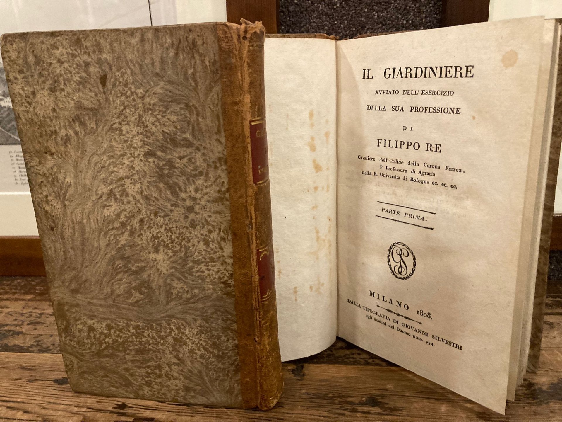 Due volumi in-8°, pp. XII, 280; 373 (3), mezza pelle nocciola con titoli e tomaisons su tasselli in marocchino ai dorsi. In fine al secondo volume su due fogli ripiegati 3 tavole calcografiche raffiguranti attrezzi e pratiche del giardinaggio. Firma antica di appartenenza al frontespizio del secondo volume. Fresco esemplare genuino. Non comune edizione complessivamente originale con questo titolo dal momento che la sola prima parte (qui emendata e con aggiunte di due paragrafi) era precedentemente uscita dai medesimi torchi titolata 'Elementi di giardinaggio'; la seconda parte è invece del tutto inedita ed è in pratica una tassonomia nomenclatrice botanica in ordine alfabetico (sulle tracce di Linneo, ed. Wildenow 1802 e del Savi, Flora pisana). Autorevole trattazione di manuale di giardinaggio, orticoltura, fioricoltura e frutticoltura. Si segnalano i modi di coltivare gli agrumi (aranciera), le piante da stufa, seminazione, trasporto delle piante vive, coltivazione delle piante resinose, grasse, bulbose ed alpine. Filippo Re (Reggio Emilia, 1763 - 1817), professore di agricoltura e di botanica all'Università di Bologna, fu autore di svariate opere di orticoltura e giardinaggio che lo fecero emergere come il massimo agronomo dell'Ottocento italiano.