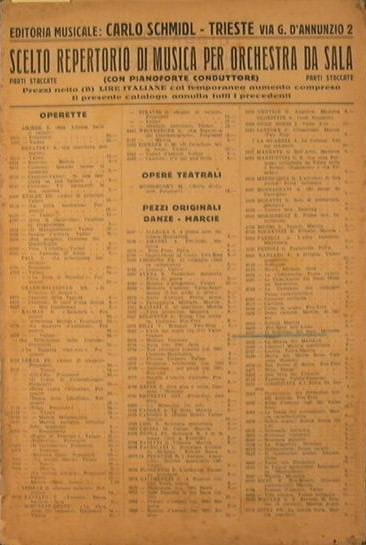 Scelto repertorio di musica per Orchestra da Sala - in 8° - pp.25 ad un fronte - Brossura editoriale - Partitura per Contrabbasso, Violoncello, Violini, Clarino, Pianoforte, Flauto, Batteria, Trombone e Cornetta