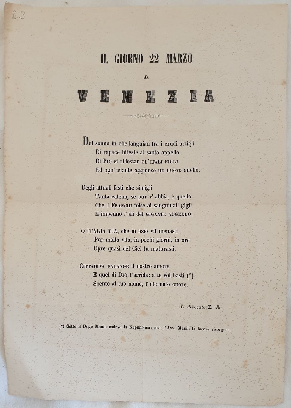 Rarissimo poema dedicato ala proclamazione della Repubblica di San Marco avvenuta il 22 marzo 1848 a seguito dell'insurrezione della città avvenuta il 17 marzo. Ideatore della rivolta fu l'avvocato veneziano Daniele Manin. Autore anonimo "Avvocato I.A." In buone condizioni. Fioriture. Piegatura orizzontale. In 4. Dim. 29,5x21 cmVery scarce poem dedicated to the proclamation of the Republic of San Marco happened the 22nd of march 1848 following the insurrection of the city of the 17th of march. Creator of the riot was the lawyer from Venice Daniele Manin. Anonymous author "Avvocato I.A." In good conditions. Foxing. Horizontal folding. In 4. Dim. 29,5x21 cm