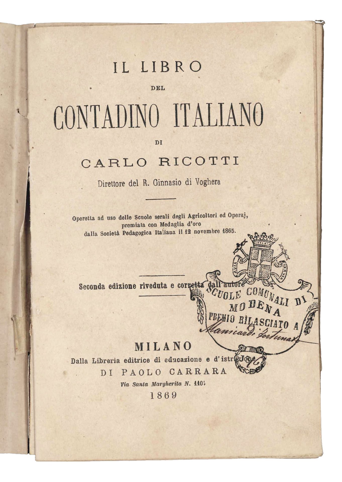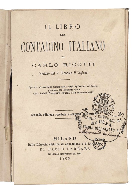 Mm. 169x110. Pp. 210. Cc. lievemente ed uniformente brunite. Al frontespizio timbro delle scuole comunali di Modena con premio rilasciato a Manicardi Fortunato. Rilegato in pelle con titolo, 'Comune di Modena. Scuola di S. Cattaldo. Classe I', entro cornice ornamentale al piatto anteriore (titolo sbiadito, esemplare sciolto). Seconda edizione riveduta e corretta dall'autore.