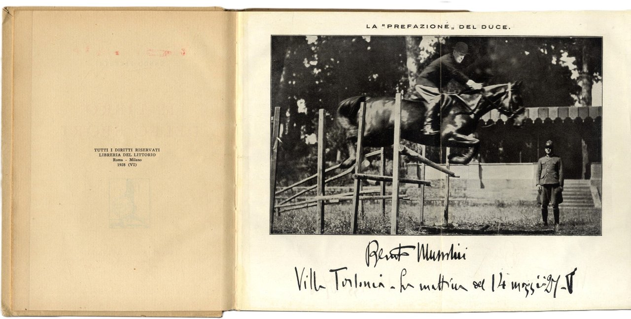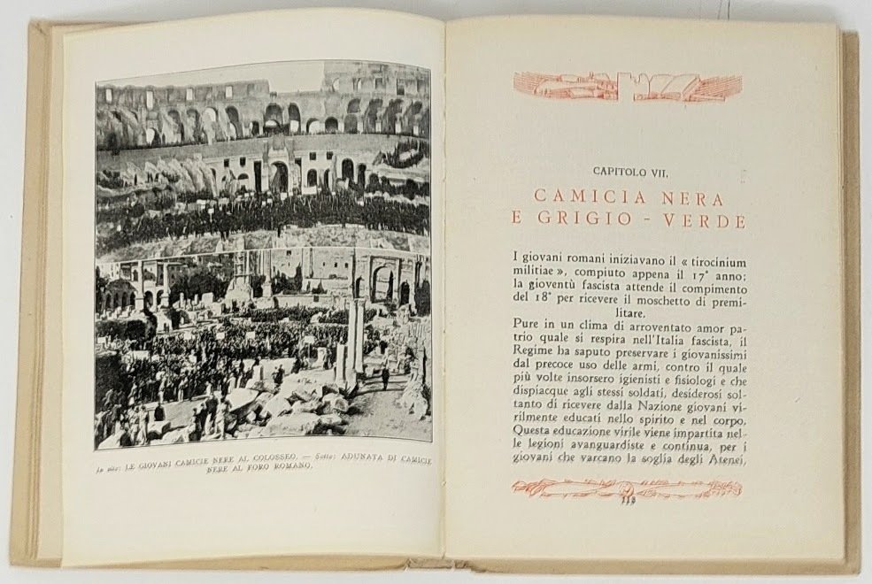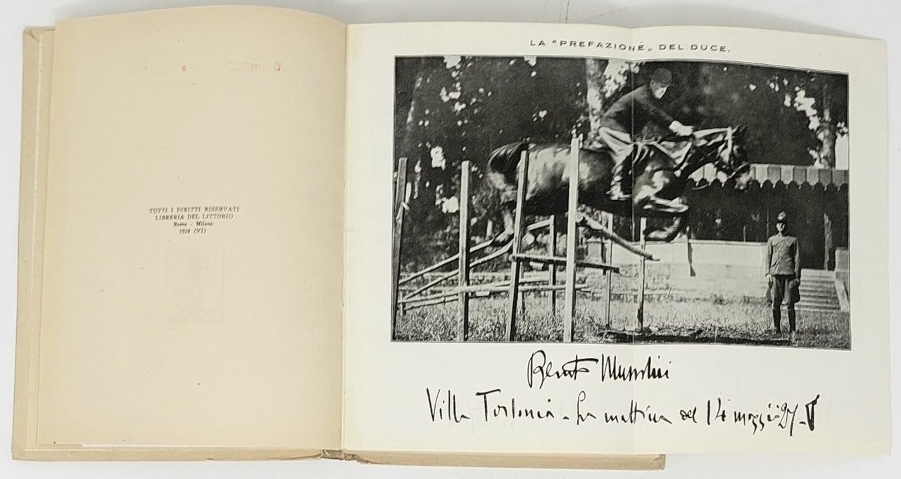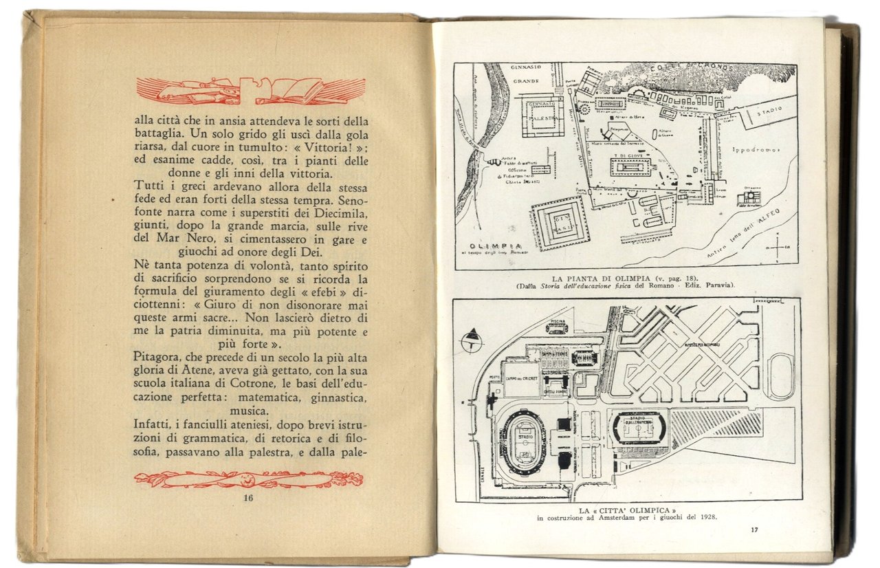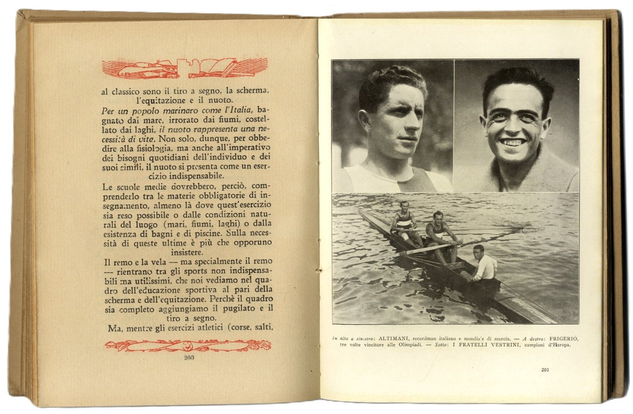 >in-16 (193x145 mm), pp. 295, (1); legatura in cart. editoriale, titolo in rosso e nero al piatto superiore e al dorso. Interessante monografia di epoca fascista dedicata allo sport come "azione vissuta, in ampiezza d'orizzonti, in terra, sulle acque, nel cielo... Lo sport, virile espressione della nuova giovinezza d'Italia..." Deliziosa pubblicazione, con fregi in rosso su ogni pagina e 32 illustrazioni f.t. tra le quali, in "prefazione", un'immagine che ritrae il Duce mentre esegue un salto a cavallo, autenticata dalla sua firma in facsimile e dalla data della bella impresa sportiva. In appendice, elenco degli enti sportivi internazionali e nazionali dell'epoca, statuto del CONI, leggi e regolamenti dell'opera nazionale Balilla e Libro d'Oro delle Olimpiadi e "records" atletici. Ottimo esemplare.