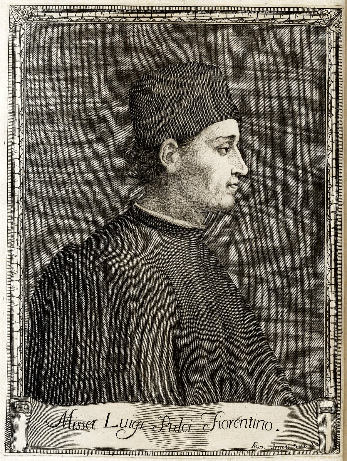 >in-4, pp. (16), 338, legatura coeva mezza pelle, titolo dorato su tassello al dorso. Con un magnifico ritratto a piena pagina del Pulci, in antiporta, inciso in rame da Franc. Sesoni, titolo a stampa rossa e nera con piccola impresa tipografica, bordura xilogr. racchiudente l'argomento dei canti, finalini. Dedica di Pier Ismaele Pedagucci a Matteo di Sarno, patrizio di Benevento. Pregiata edizione critica di questo celebre poema, probabilmente curata da Lorenzo Ciccarelli ed edita da G.M. Porcelli. Bell'esemplare. Gamba, n. 793: «Quest'edizione intera, corredata dalla vita del poeta, e dai Vocabolaristi giudicata la più corretta d'ogni altra. Gli argomenti in versi, premessi a ciascun canto, sono di Iacopo Ant. Lucchesi». Melzi 500. Razzolini, 281-2. Parenti, Luoghi falsi p. 89.