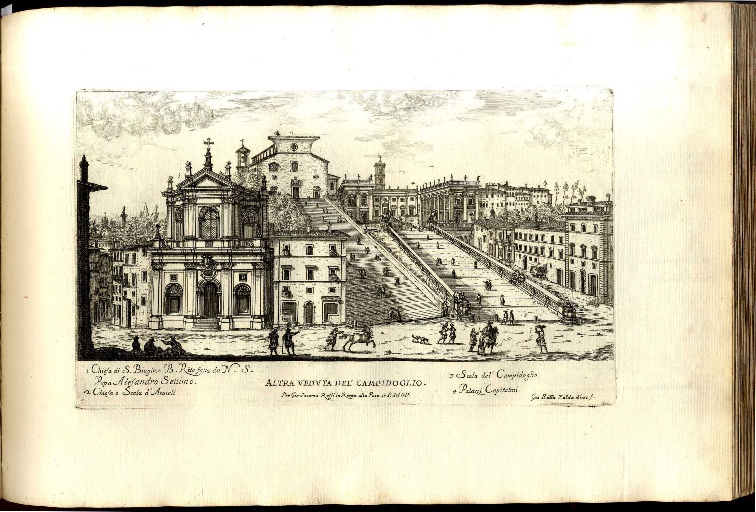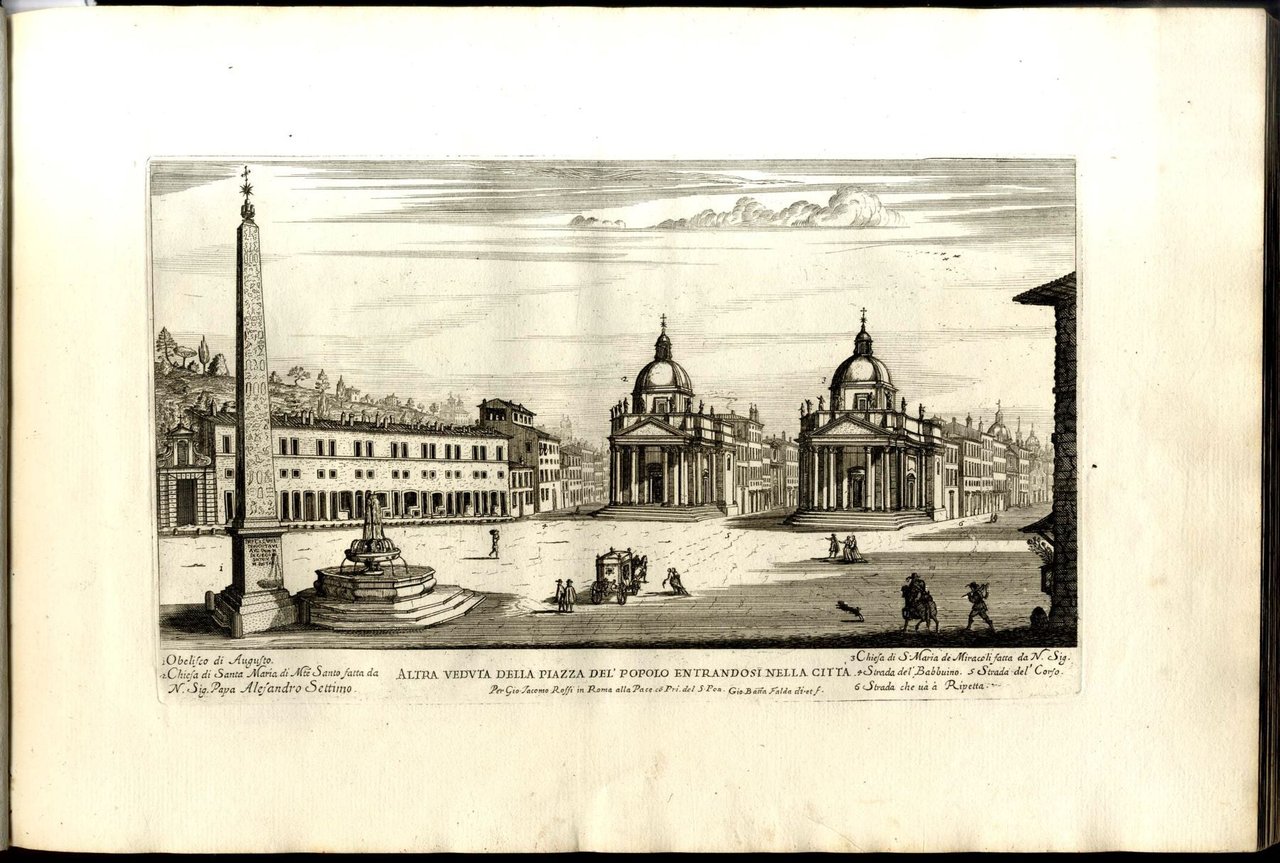 Quindi questa serie di vedute, dal Pontefice commissionata al Falda è di enorme importanza per l'urbanistica, l'architettura dei palazzi e delle chiese della città e dei dintorni (Castelgandolfo, Trastevere). Le vedute sono fedeli, disegnate con gusto ed incise con abilità, esattezza ed eleganza. L'opera venne stampata presso l'editore De Rossi, con il quale il Falda (1643–1678) stabilì un inscindibile ed efficace sodalizio e al quale si deve gran parte della produzione grafica del secolo XVII a Roma, con fortuna paragonabile solo a quella che sarà tributata all'opera di G.B. Piranesi.