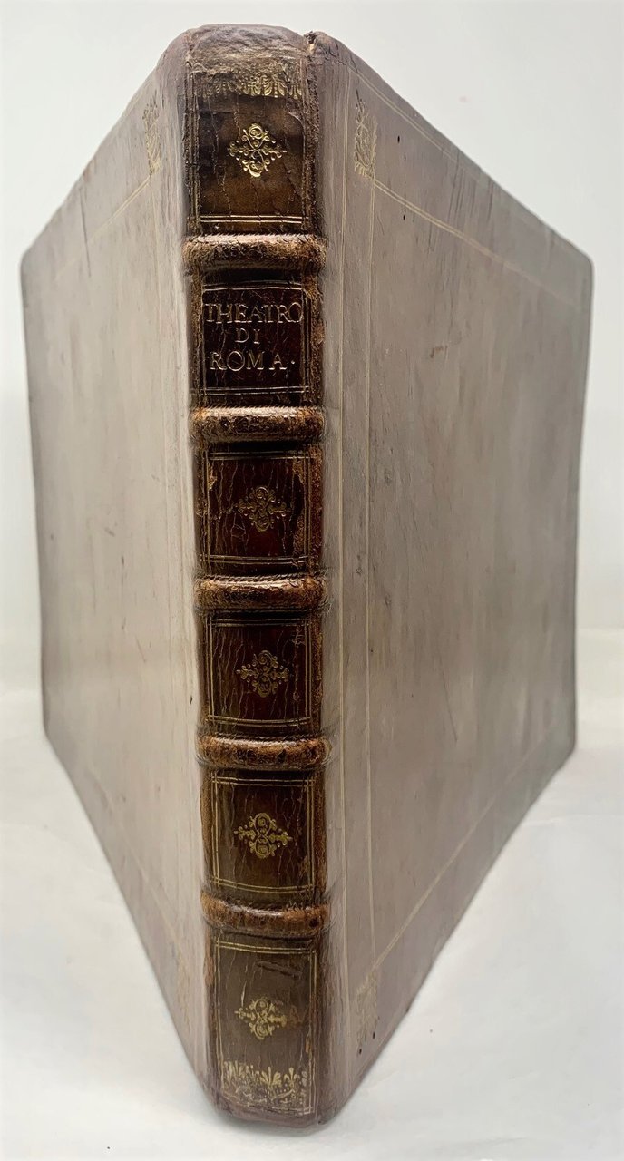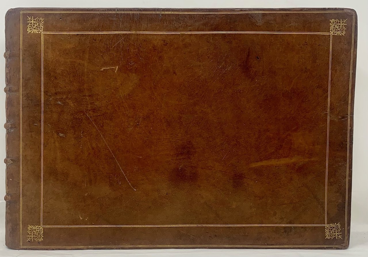 Bella legatura settecentesca in piena pelle, i piatti adorni di due duplici riquadri di filetti e grandi fregi agli angoli, dorso a nervi con fregi in oro e titolo su tassello in pelle granata, tagli spruzzati (lievi abili restauri alle cuffie).