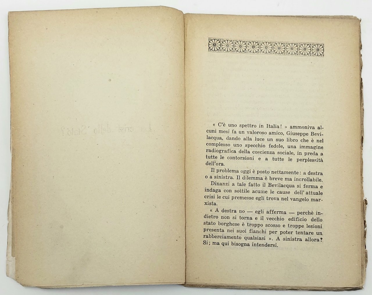 >in-16 (mm 199x120), pp. 79, broch. edit. figurata a colori. Edizione originale, rarissima, di questo panphlet sui progetti di attribuzione al Consiglio superiore del lavoro di funzioni rappresentative e legislative. Dicreto esemplare, a fogli chiusi (piccole mancanze alla coperta).