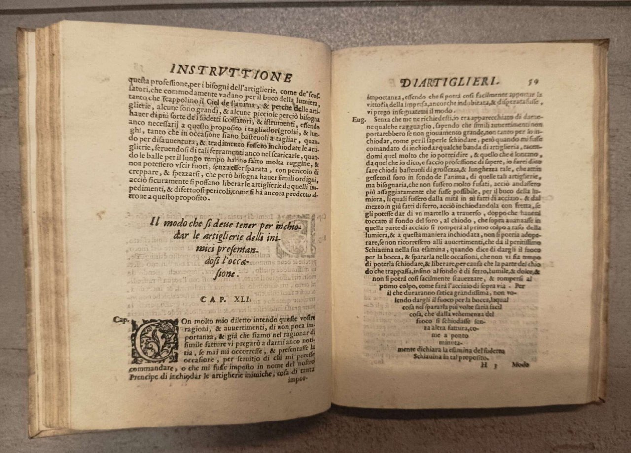 >in-4 (mm 213x160), ff. (4), 143, (manca ultimo bianco), leg. coeva in p. pergamena molle, titolo manoscritto al dorso. Al tit. curiosa vignetta silogr. raffigurante un mortaio in azione durante l'assedio di una città; numerose graziose scene, tutte in silogr., n.t. raffiguranti il modo di impiegare cannoni, mortai ed armi ed il loro funzionamento. Testatine, finalini ed iniziali istoriate. Quarta edizione del lavoro del Gentilini; l'opera era già apparsa nel 1592 con il titolo ''Istruttione de' Bombardieri'', nel 1598 con il titolo ''Istruttioni di artiglieria'' e nel 1606. Si tratta di uno dei più approfonditi trattati per la formazione degli artiglieri. In fine, con proprio tit., un discorso in forma di dialogo del medesimo autore sulle fortezze. Curioso ed inusuale testo di arte militare, (aloni nei margini di alcuni ff., falla con perdita di 3 lettere in 1 f.). Cockle 669. Vinciana n. 1434 ''...importante opera che tratta anche di artiglieria navale''. Riccardi I, 586. Michel-Michel IV, pp. 31-32. Graesse III, 50.