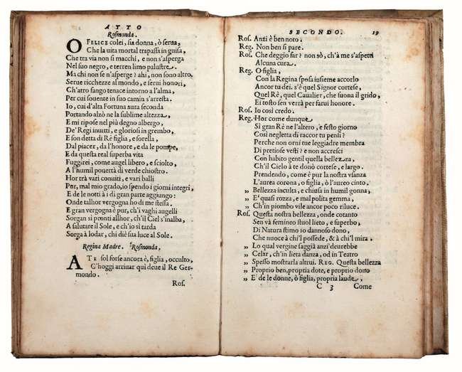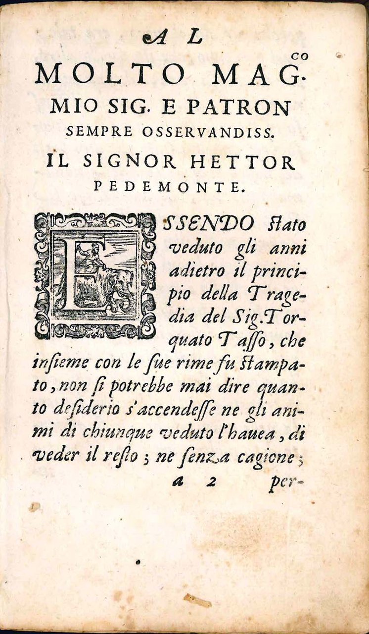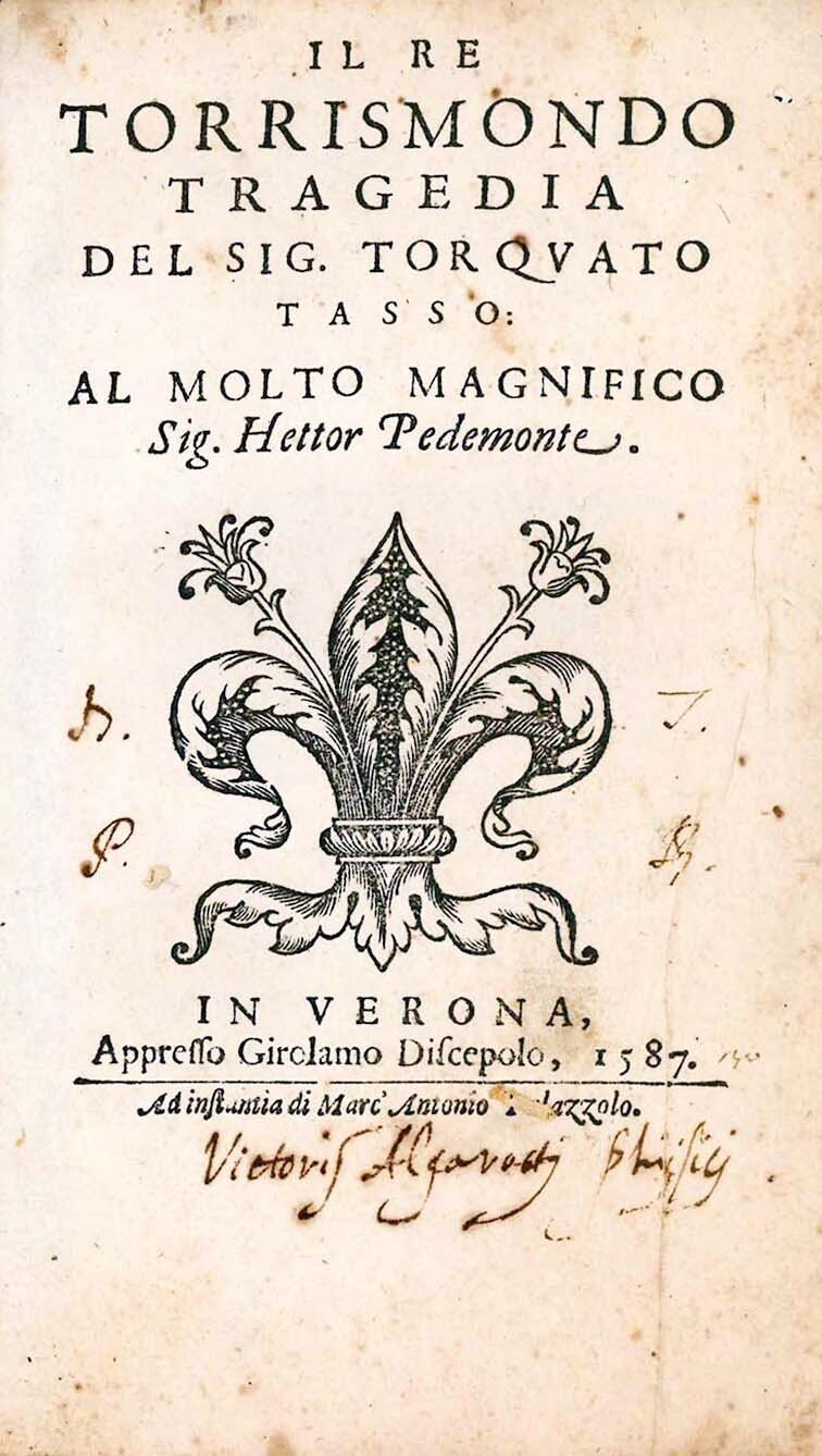 Probabile seconda edizione di questa fortunata tragedia, la cui prima edizione, con dedica al Duca di Mantova Vincenzo Gonzaga, venne stampata nello stesso anno a Bergamo in formato in 4to. La presente edizione, oltre alla dedica originale del Tasso, reca inoltre una dedica indirizzata dall'editore Marco Antonio Palazzolo ad Ettore Pedemonte. L'opera ebbe tale successo che nel solo anno 1587 ben 10 edizioni apparvero sul mercato, stampate in diverse città italiane, tra cui Ferrara, Mantova, Venezia, Cremona, Genova e Bologna.