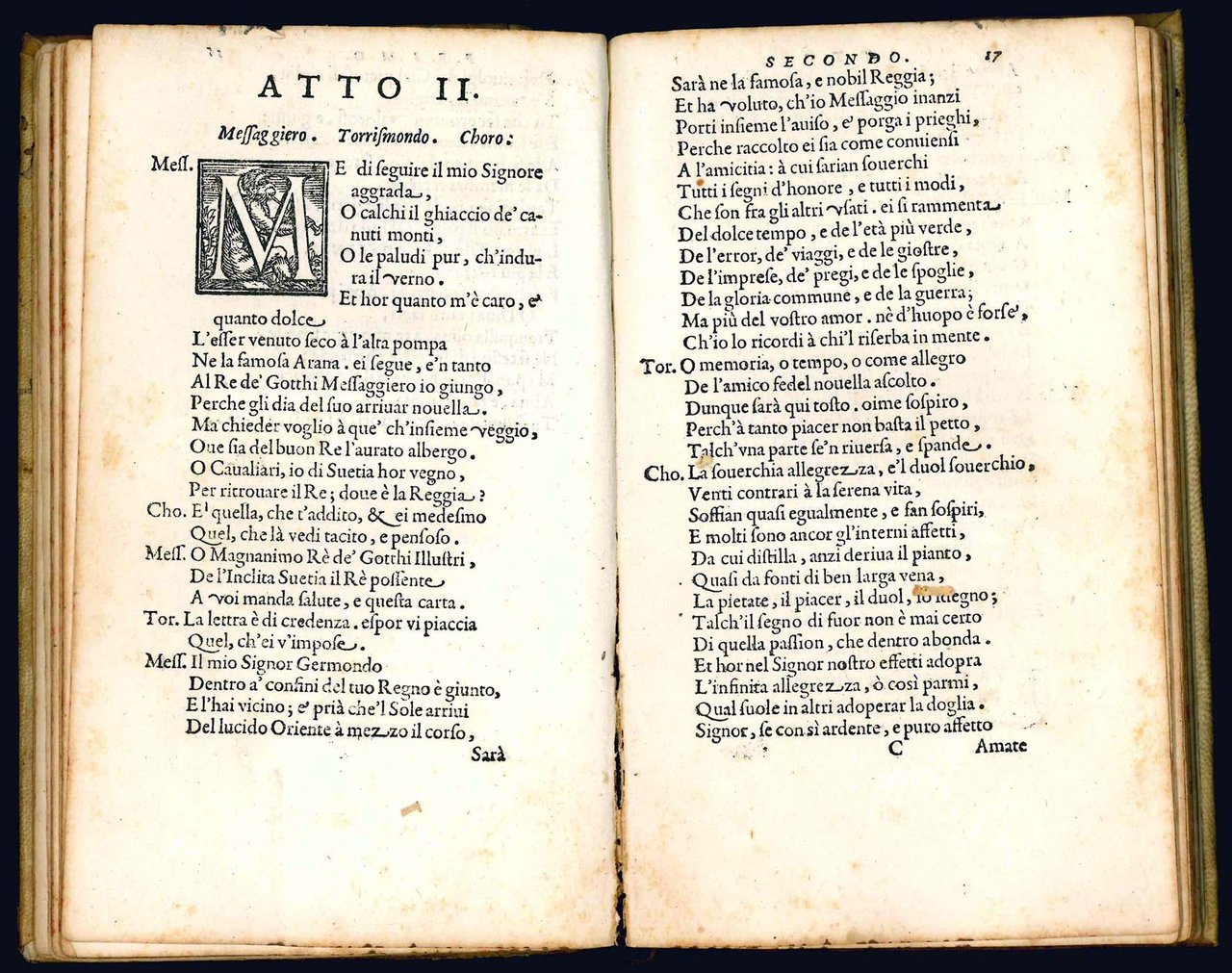“A much more celebrated imitation of Sophocles' Oedipus, and the best-known Gothic tragedy in the sixteenth century, is Torquato Tasso's Il re Torrismondo, first printed at Bergamo, Mantua, Turin, Ferrara, Verona, and Venice in 1587, but written earlier, perhaps started as early as 1573, right after he finished his dramatic masterpiece, the pastoral Aminta. As is well known, Tasso was plagued thoughout his literary life by the quarrel between Ancients and Moderns, between classicism and romanticism. By 1587 the classicists had won and Tasso was brought into subjection, though no Aristotelian criticism could wholly stifle his romantic instincts and his genius for lyric expression… The romantic argument was drawn from the Gothic past of northern Italy. Rosmonda, daughter of the king of the Goths, was fated by the stars to cause the death of her brother Torrismondo, heir to the throne…” (M.T. Herrick, Italian Tragedies in the Renaissance, Urbana, 1965, pp. 228-230).