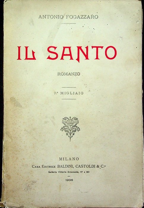 477 p., 20 cm, bross. Condizioni : USATO - Stato : Buono, ordinari segni d'uso e del tempo, timbro con eliminazione. Altre note : Edizione originale. Il romanzo, che finì immediatamente all'indice, suscitò vasti clamori tra modernisti e tradizionalisti ancor prima dell'uscita che avvenne alla fine di novembre del 1905; la stessa tiratura fu poi proseguita per tutto il 1906 sino al 30° migliaio