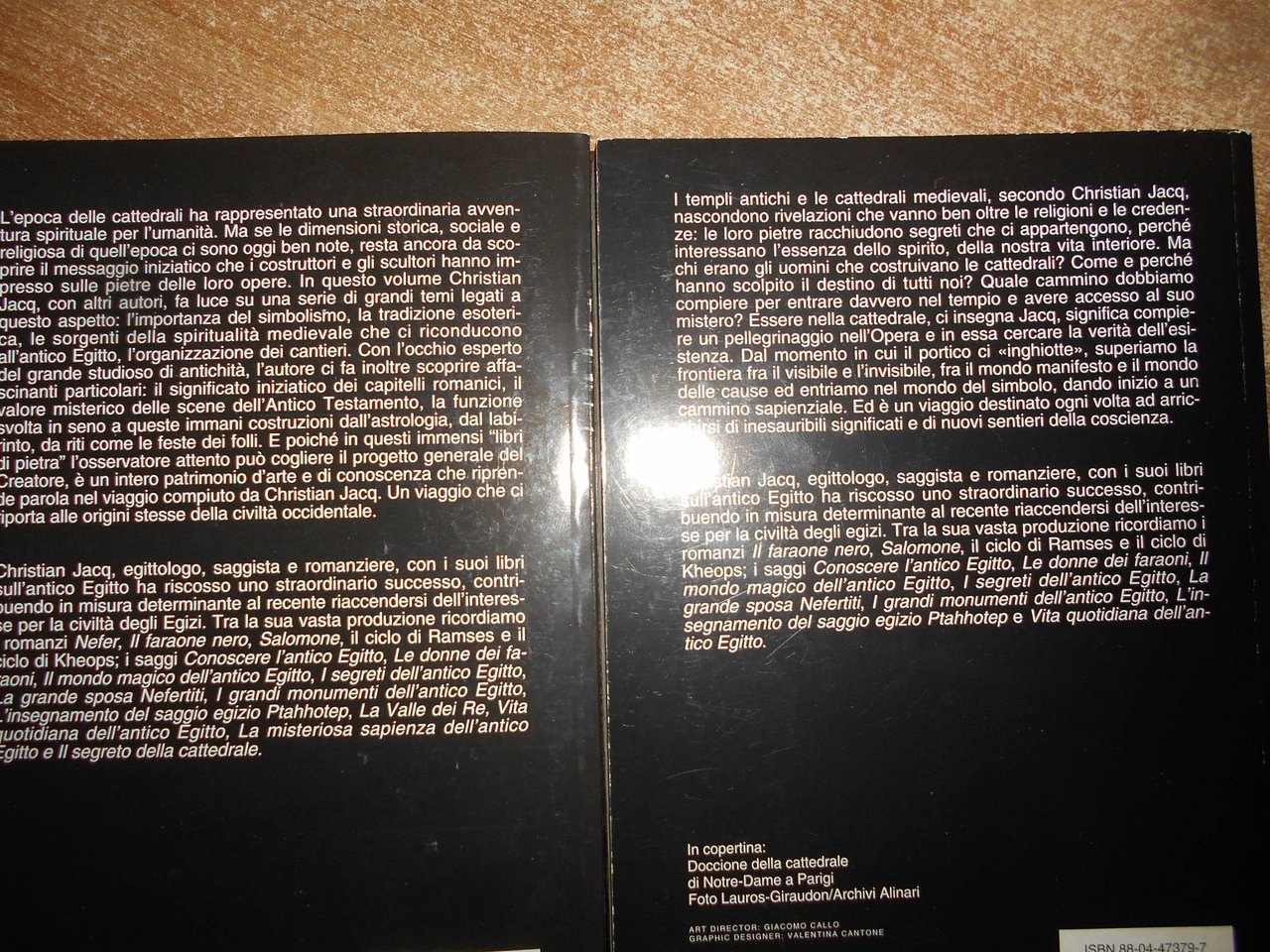 CHRISTIAN JACQ. Milano, Mondadori, 2000. Il Segreto della Cattedrale/Il Messaggio Iniziatico delle Cattedrali. 2 volumi in-8° piccolo, br. 189 pp.; 238 pp. In ottimo stato di conservazione. Neg. mob. bianco nuovo comput. entro busta trasp.