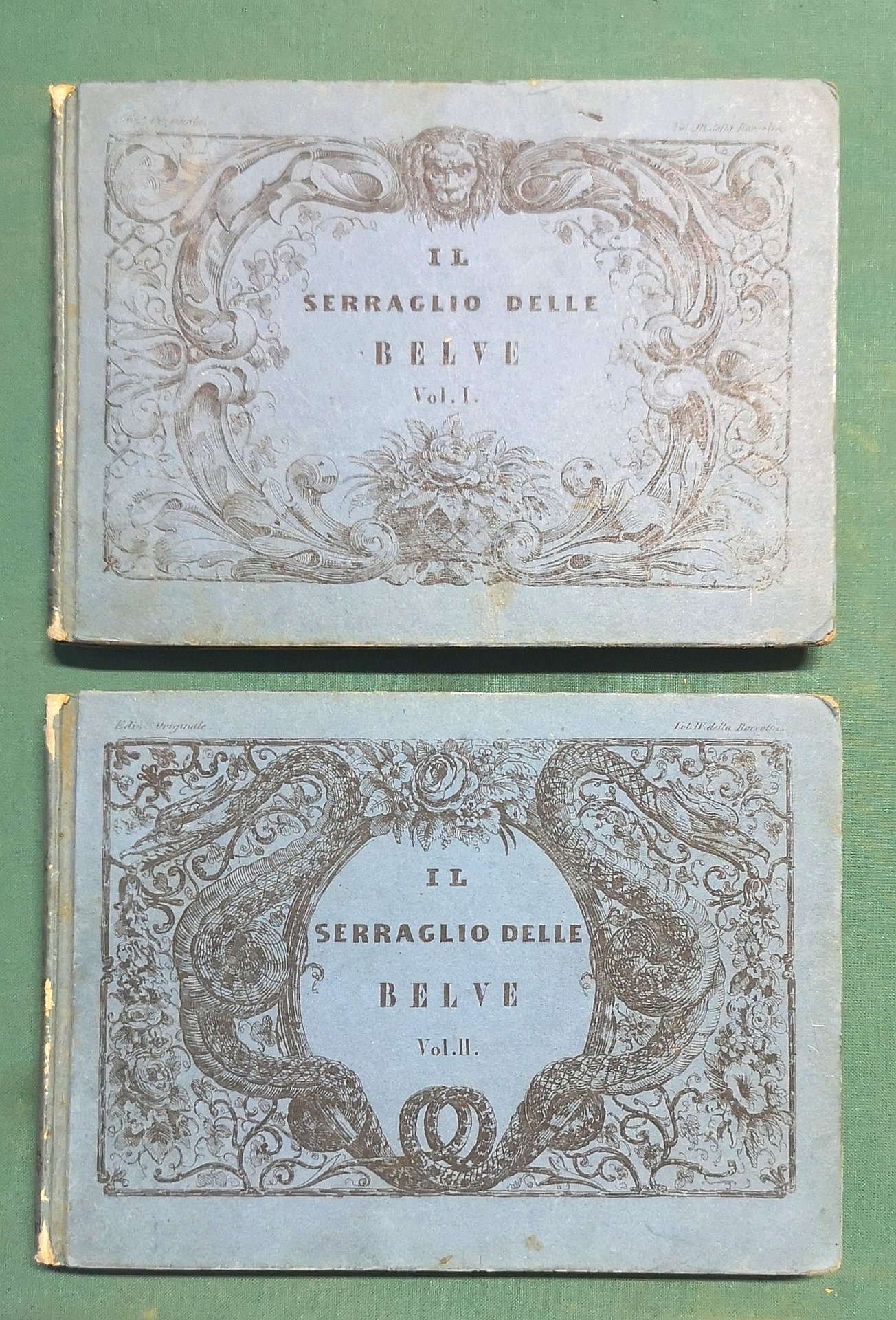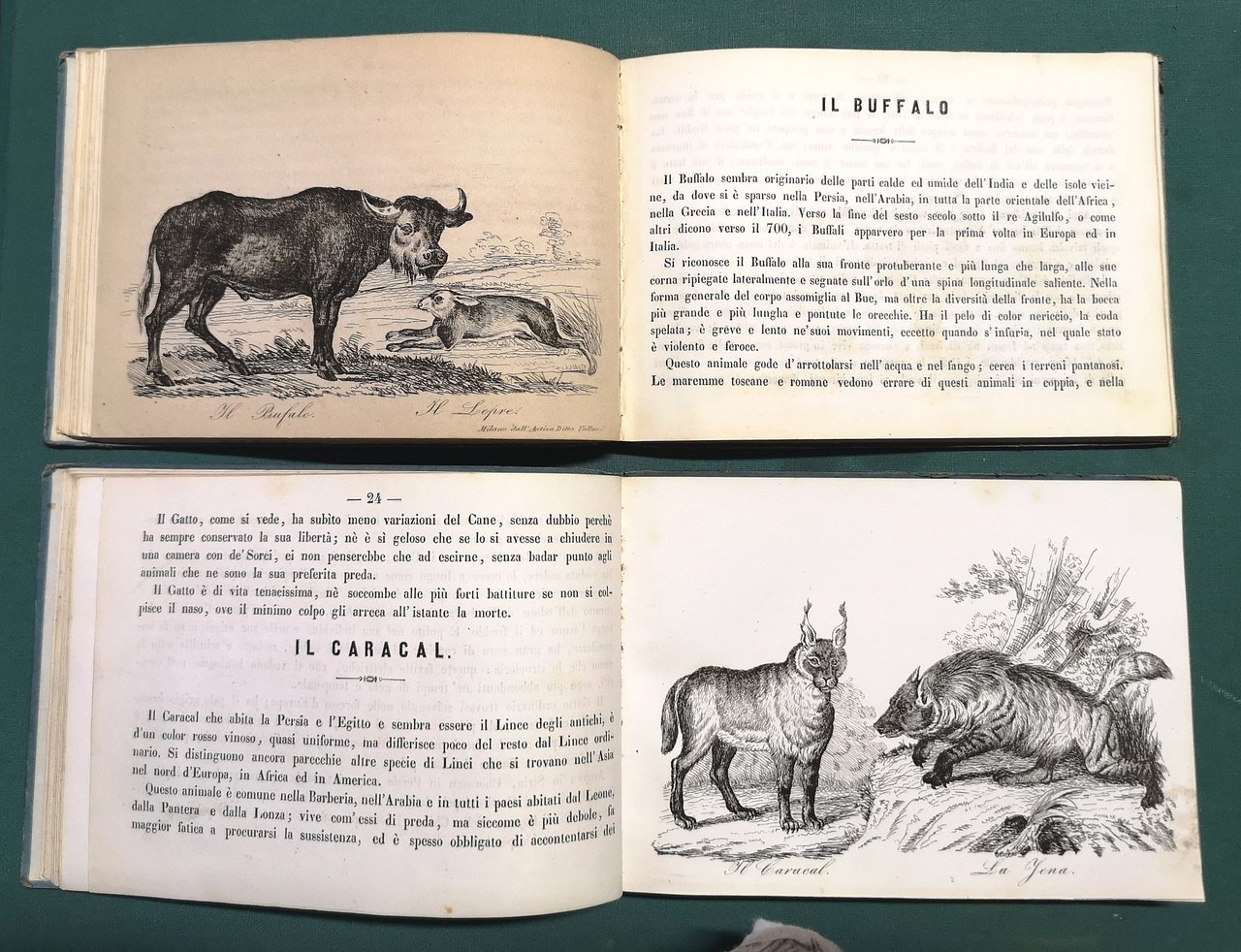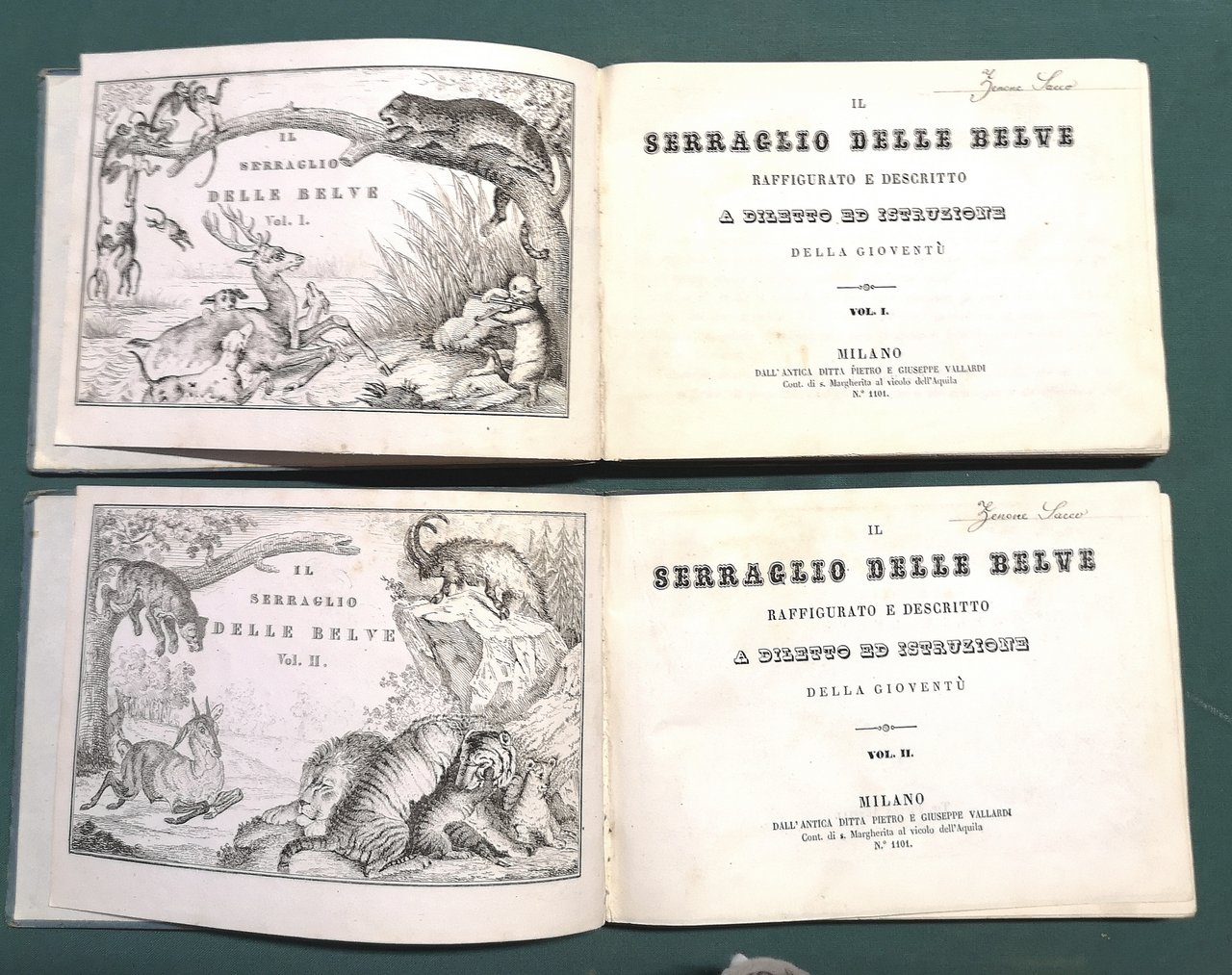>2 vol. in-24 oblungo, pp.87, (1); 102, (2), leg. in cart. edit. figurate in nero al piatto ant. con graziose cornici a motivi faunistici, antiporta figurati e 66 tavole complessive a piena pagina f.t. Rarissima edizione originale di quest'opera di zoologia descrittiva dedicata ai ragazzi e splendidamente illustrata da incisioni raffiguranti animali, locali ed esotici, ritratti nei propri ambienti naturali. Ottimo esemplare, freschissimo (nota d'appartenenza ms. al frontespizio)