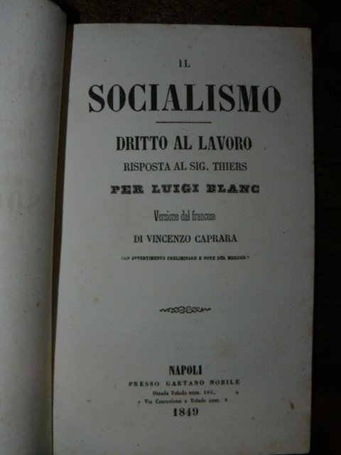 Il Socialismo dritto al lavoro. Risposta al sig. Thiers per Luigi Blanc. Versione dal francese di Vincenzo Caprara