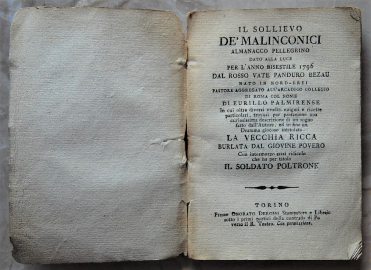 IL SOLLIEVO DE' MALINCONICI. ALMANACCO PELLEGRINO DATO ALLA LUCE PER L'ANNO BISESTILE 1796 DAL ROSSO VATE PANDURO BEZAU.