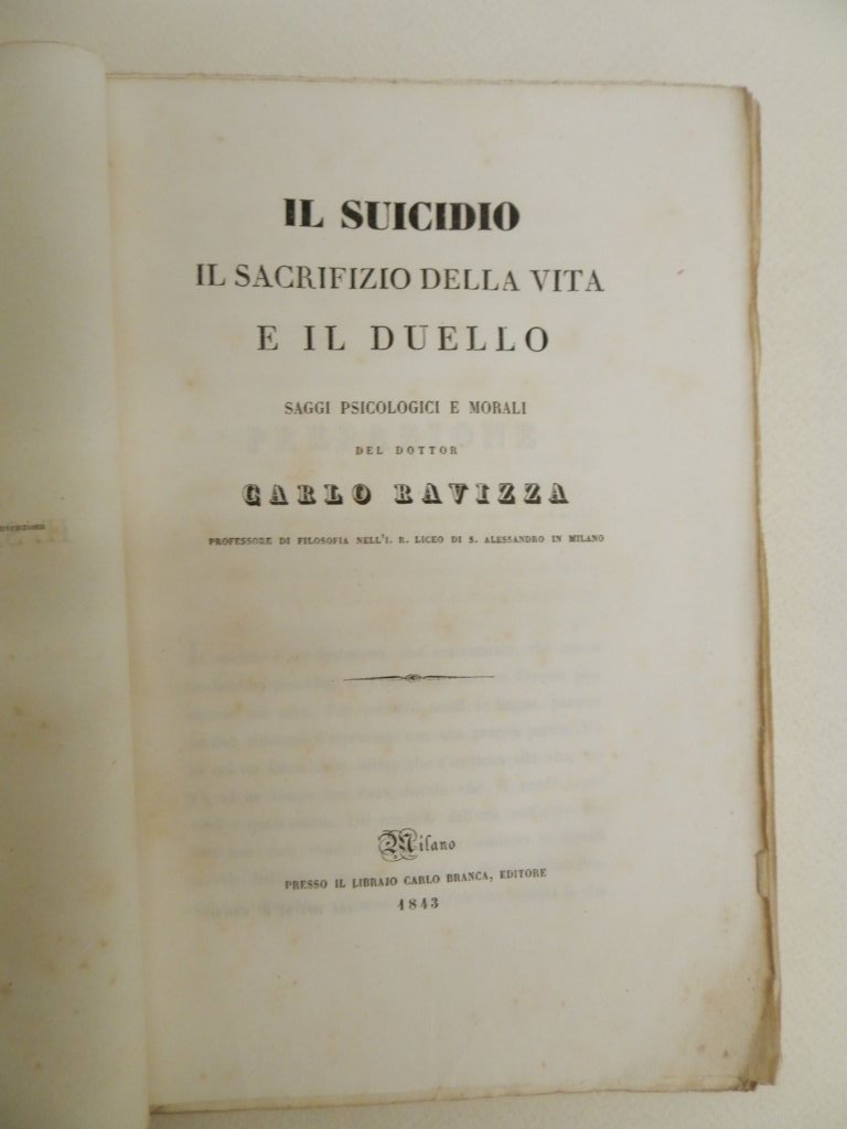 8^, pp. 223; copertina originale, al primo piatto, dorso e seconda copertina rifatti. Opera filosofica e morale in cui il politico e filosofo milanese argomenta contro il duello. Esemplare nell'assieme molto buono. *** TUTTI I NOSTRI LIBRI SONO VISIBILI PREVIO CONTATTO MAIL O TELEFONO NELLA NUOVA SEDE DI MILANO: LIBRERIA COSMOPOLIS, VIA JOMMELLI, 22. ***