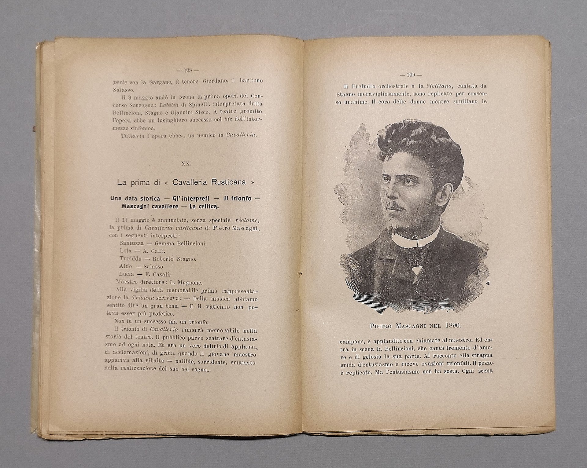 >in-16, pp. 216, (1), (7, di pubblicità), numerose illustrazioni n.t., broch. edit. Cronaca di 27 anni di vita teatrale a Roma. Particolare attenzione è diretta verso coloro i quali contribuirono alla fortuna del teatro, in primo luogo a Domenico Costanzi ed alle importanti rappresentazioni che si tennero nel teatro: l'Otello, il Falstaff, l'Iris, La Tosca etc. (Firma di possesso al titolo, in parte abrasa)