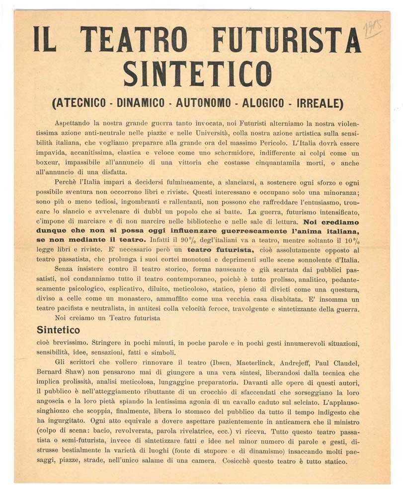 MANIFESTOPrima edizione.Ottimo esemplare (minima lacerazione ricoposta, senza perdite, al bordo esterno del primo foglio).Prima edizione assoluta del secondo manifesto futurista dedicato al teatro (dopo il «Teatro di varietà» del 1913, firmato dal solo Marinetti). Prosegue sulla falsariga tematica del primo, ma con maggior organizzazione espositiva. Ne uscì praticamente subito una seconda edizione modificata, poi un’edizione francese con varianti e data 11 maggio 1919 (Tonini, I manifesti, 87.1, cita come prima la seconda ed. modificata).