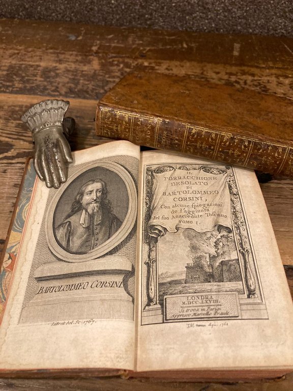 2 voll. in-12° (145x85mm), pp. (4) XV (1) 383 (3), bianche; (4), 375, (3) bianche; bella legatura coeva in p. pelle nocciola spugnata con titoli e fregi fitomorfi dorati ai dorsi, sgaurdie carta decorata, tagli rossi. Ritratto dell'autore inciso su rame dal Littret all'antiporta del primo vol.; frontespizi figurati calcografici di Jean Michel Moreau. Un albero genealogico ripiegato f.t. al primo vol. dei Corsini da Barberino. Firme di appartenenza alla carte bianche anteriori.Minimi difetti alle cuffie e agli angoli esterni della legatura. Una lievissima gora ai margini esterni della carta di ritratto, minime bruniture ai frontespizi ma bell' esemplare. Prima edizione di questo poema eroicomico in 20 canti in ottave. Precede una lettera del Conti al Coqueley de Chaussepierre. Le pp. 221 e sgg. del secondo vol. contengono un'estesa spiegazione di voci e modi di dire contenuti nel poema e la traduzione del Corsini delle liriche di Anacreonte. 'Il poema restò inedito per più di un secolo: intorno al 1740 se ne trattava la stampa in Bologna (Quadrio, VI, p. 729), ma solo nel 1768 Giuseppe Conti lo pubblicò a Parigi, sotto lo pseudonimo di Meo Crisoni e con gli argomenti dei canti composti dal vallombrosano padre Benedetto Bertia, presentandolo come uno dei migliori esempi di racconto eroicomico. Il torracchione del titolo allude forse a un avanzo diroccato presso Barberino ma non risultano storie locali che possano esser servite come fonte. Il carattere folclorico del poema è dunque da cercare altrove, in alcuni episodi di magia o riprese del meraviglioso mitologico o riferimenti a feste e riti popolari. Rispetto ad altri poeti eroicomici il Corsini si vale di una maggiore indipendenza nel trattamento della materia, ciò che conferisce all'opera quel carattere romanzesco, più volte rilevato, che si manifesta non tanto nella complicazione del racconto quanto nella frequente commistione, tipica della poetica secentesca del romanzo, di materiali tematicamente e stilisticamente assai diversi. Nell'ambito del genere eroicomico, il rilievo dato agli aspetti romanzeschi è un altro segno della stanchezza che il genere cominciava a denunciare: in tal senso è pure significativo che solo nel Settecento, come anche avvenne in altri casi, il poema potesse esser pubblicato. Nel suo insieme l'opera è tributaria del tradizionale linguaggio letterario toscano ed è stata in particolare accostata al Malmantile racquistato del Lippi. Parti di solenne intonazione epica si alternano alla caricatura della società provinciale, a temi patetici, a toni schemevoli. La vena scurrile di comica festevolezza, tradizionale nel 'genere', trasmoda talvolta verso forme di una torbida oscenità.' (Martino Capucci in D.B.I., XXIX, 1983). Parenti, Prime edizioni, p. 172. Parenti, Luoghi di stampa falsi p. 119. Gamba, 1894: 'Dobbiamo questa elegante ediz. a G. Conti, che vi aggiunse sue spiegazioni, e la versione di Anacreonte, fatta dal Corsini'. Brunet, II, 308. Graesse, II, 277.