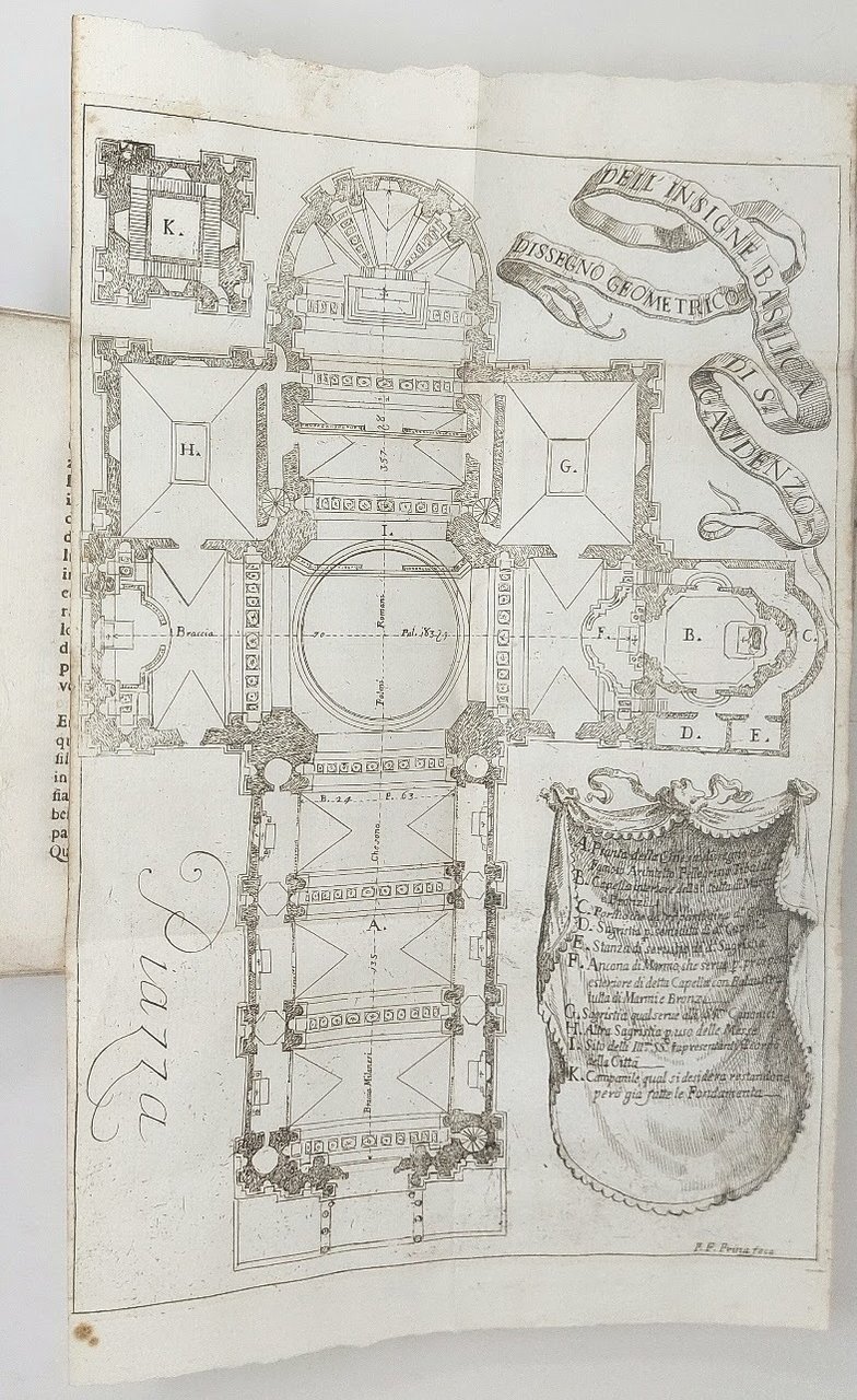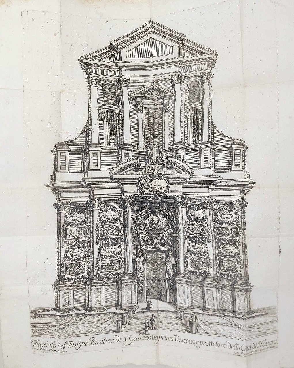 >in-4 (235x195 mm), pp. (8), 154, antiporta inciso e 4 grandi e stupende tavole più volte ripiegate (su 7), incise in rame da Paolo Bianchi. Legatura in pergamena coeva (antico remboitage). Prima ed unica edizione, rarissima, di opera importante per l'architettura e la storia sacra di Novara, senza dubbio l'opera più importante tra le veramente poche dedicate alla città. Pochi sono gli esemplari censiti, specie completi di tutte le tavole ripiegate, nel presente si trovano tutti i rami di ambito architettonico: pianta, facciata, tempio augusto e cappella della Basilica del Santo, mancano invece il ritratto del Santo, l'urna e la macchina eretta per li fuochi festivi. Buon esemplare su carta forte ed a grandi margini, in ottimo stato (salvo qualche traccia d'umido su poche pagine).