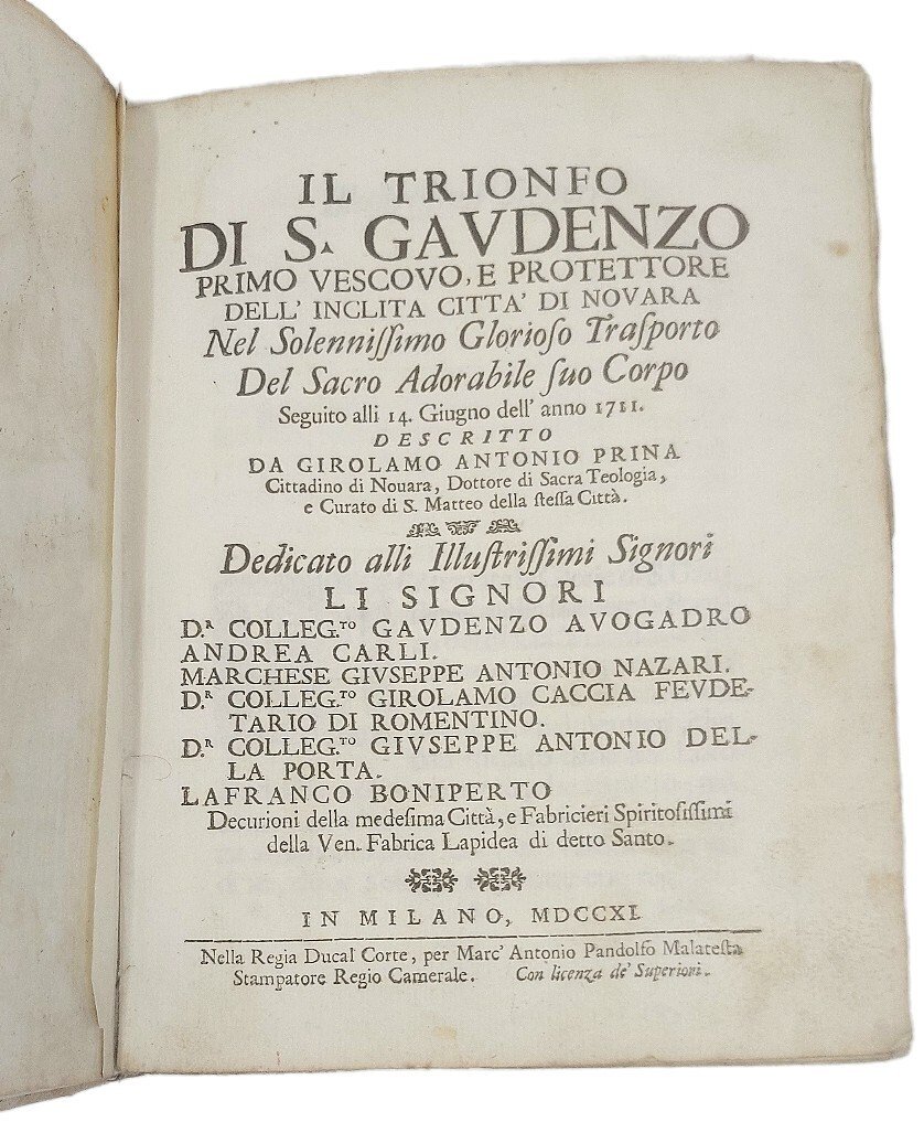 Il trionfo di San Gaudenzio primo vescovo e protettore dell'inclita città di Novara nel solennissimo glorioso trasporto del sacro adorabile suo corpo seguito alli 14 giugno dell'anno 1711. Descritto da Gorolamo Antonio Prina.