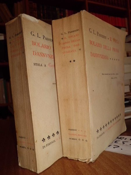 DUE VOLUMI. PRIMO VOLUME. IL VOCABOLARIO DELLA POESIA DANNUNZIANA. IN- 16°, BR, COP.ORIG. XIV, 491, (2) PP. BEN CONSERVATO. (1912). MANCA AL GUABELLO. SECONDO VOLUME. IL VOCABOLARIO DELLA PROSA DANNUNZIANA. IN-16°, BR. COP. ORIG. XIV, 640, (6) PP. BEN CONSERVATO. (1913). MANCA AL GUABELLO. Neg. mob. 6