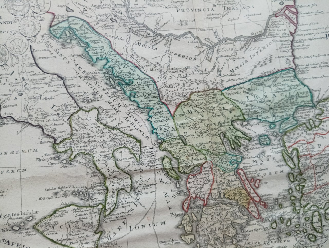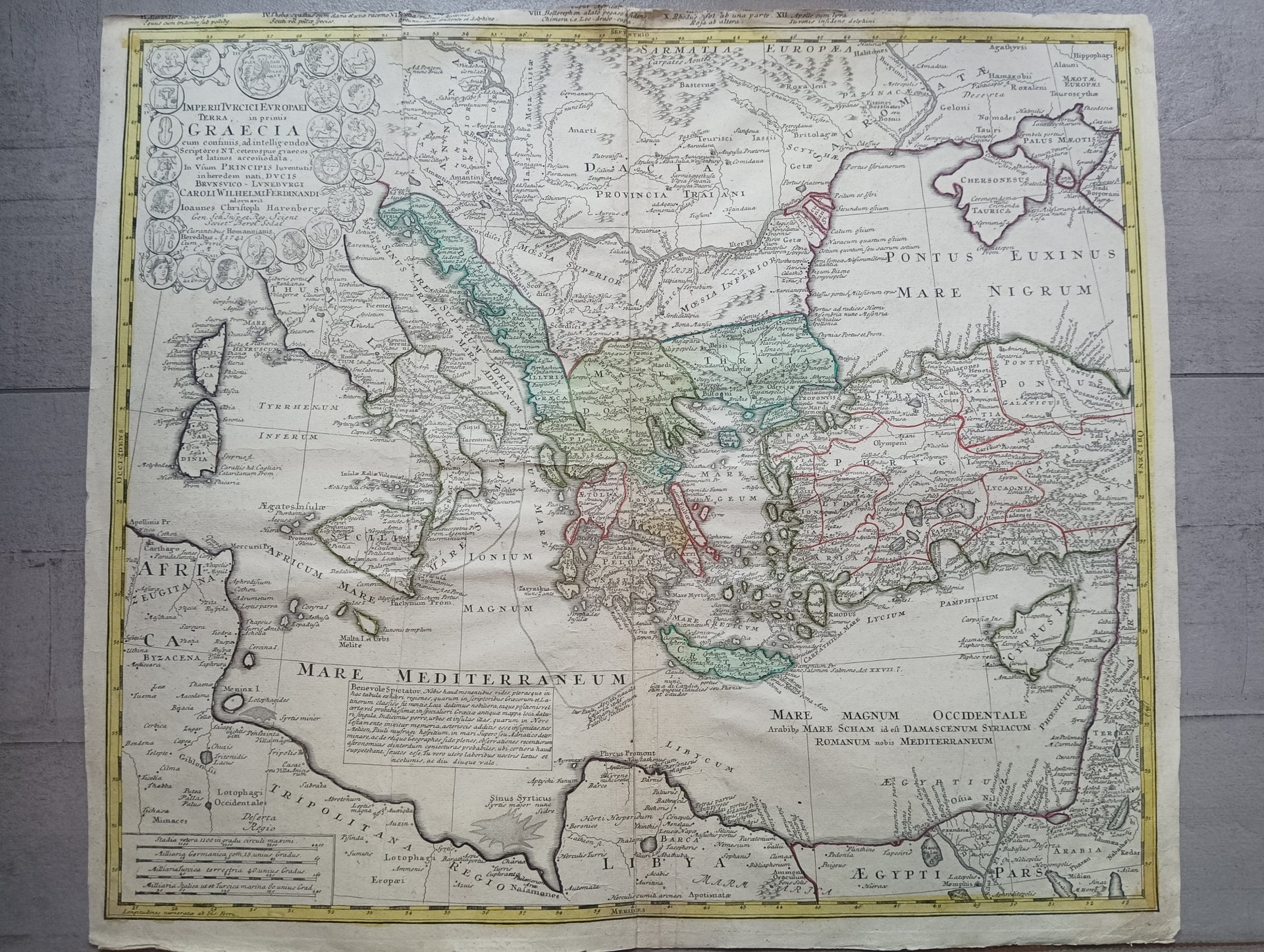 >Incisione originale in rame (mm 510x590), parzialmente colorata, con titolo entro ricco cartiglio decorato con monete. Dettagliata rappresentazione dei territori europei dell'Impero Ottomano. L'incisione, che utilizza il colore per delineare diverse regioni e confini politici, fa parte di un atlante composito che include contributi di diversi cartografi. La mappa include varie iscrizioni in latino, che forniscono nomi geografici e descrizioni, e legenda con XII richiami. Questo uso del latino indica che il pubblico a cui la mappa è destinata era costituito da europei istruiti in grado di leggere questa lingua accademica.