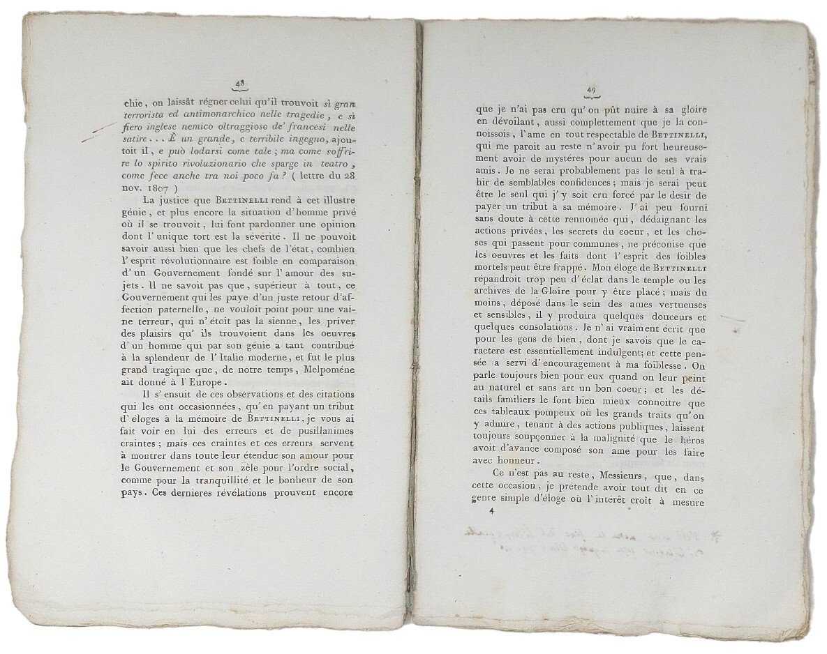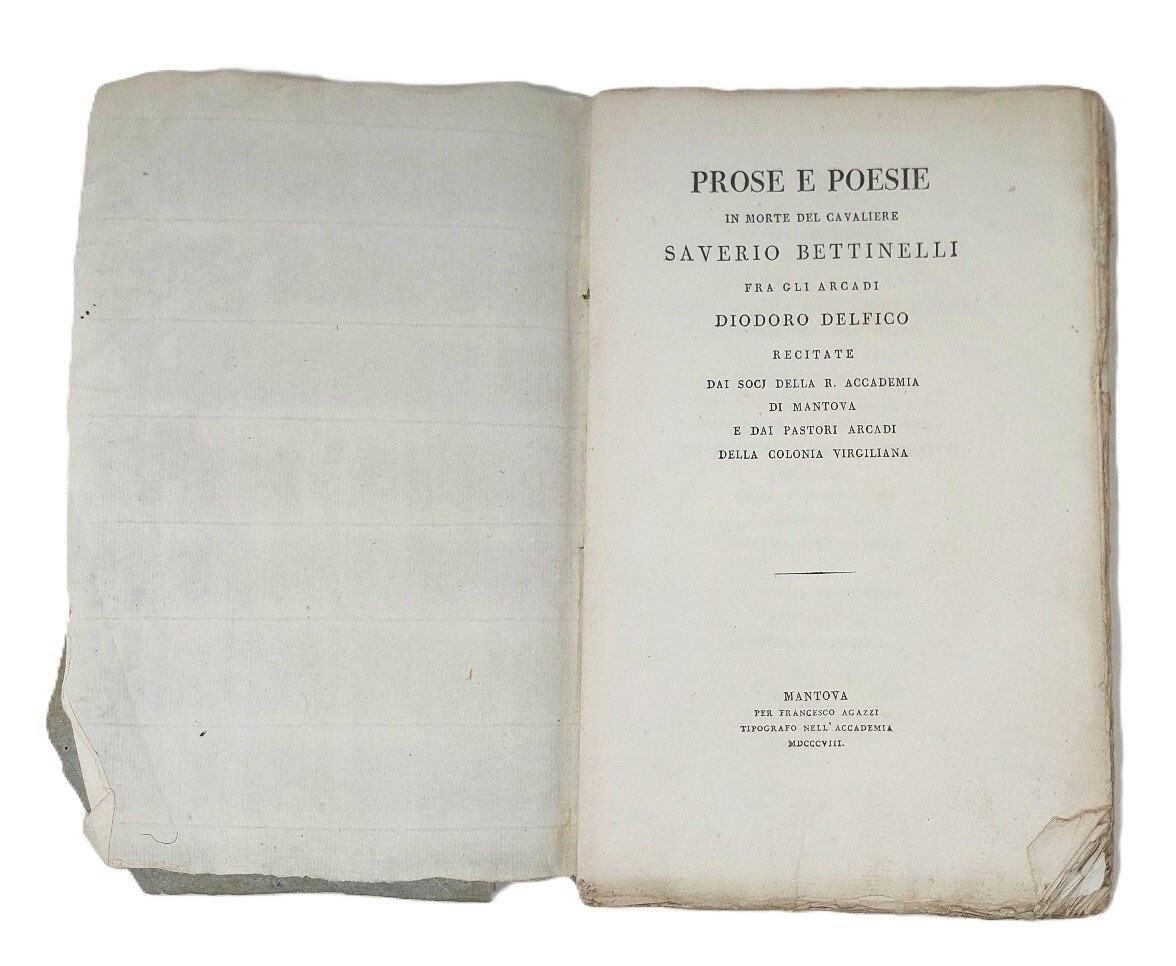 >in-8, pp. 100, (2 bianche), brossura editoriale muta. Raccolta di una quarantina di componimenti poetici o in prosa di altrettanti accademici mantovani, concittadini dell'illustre letterato morto in quello stesso anno, tra i quali Teresa Bandettini, Giov. e Ferd. Arrivabene, Ferd. Negri, Gius. Castiglione, ecc. Esemplare a pieni margini.