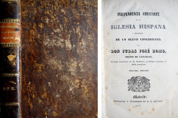 Madrid, Imprenta y Fundición de Don Eusebio Aguado, 1843. 4to.; XVII-482 pp. Encuadernación en media piel, de la época. El turolense Judas José Romo, Obispo de Canarias y posteriormente Cardenal, fue socio correspondiente de la Real Academia de la Historia. La obra presente es un instrumento de notable interés para el estudio del Regalismo en España, con abundancia de referencias documentales. En diversos pasajes se alude a temas específicamente americanos y filipinos, así como contiene curiosos datos sobre protestantes y masones en España.
