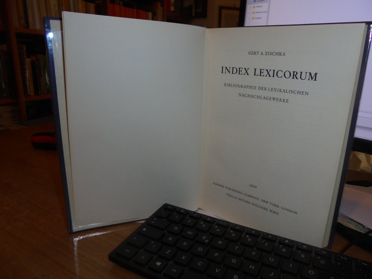 GERT A. ZISCHKA. New York/London, Hafner Publishing, Verlag Bruder Hollinek. Wien, 1959. INDEX LEXICORUM Bibliographie der Lexikalischen Nachschlagewerke. In-8°, tela con titoli, sovracopertina in acetato. XLIII, 290 pp. Perfetto esemplare in lingua tedesca. Neg. mob. 7