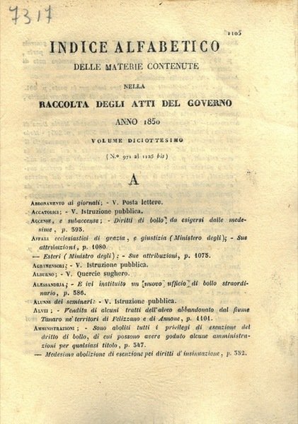Indice alfabetico delle materie contenute nella raccolta degli Atti del Governo (di S.M. il Re di Sardegna) Anno 1850.