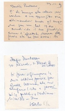 - Biglietto autografo firmato, datato 23 dicembre 1963. 70x105 mm. 1 carta (scritto recto e verso). Manoscritto a penna blu. Biglietto autografo firmato, senza data [ma 1981]. 95x95 mm. 1 carta (scritto il recto). Manoscritto a penna blu.