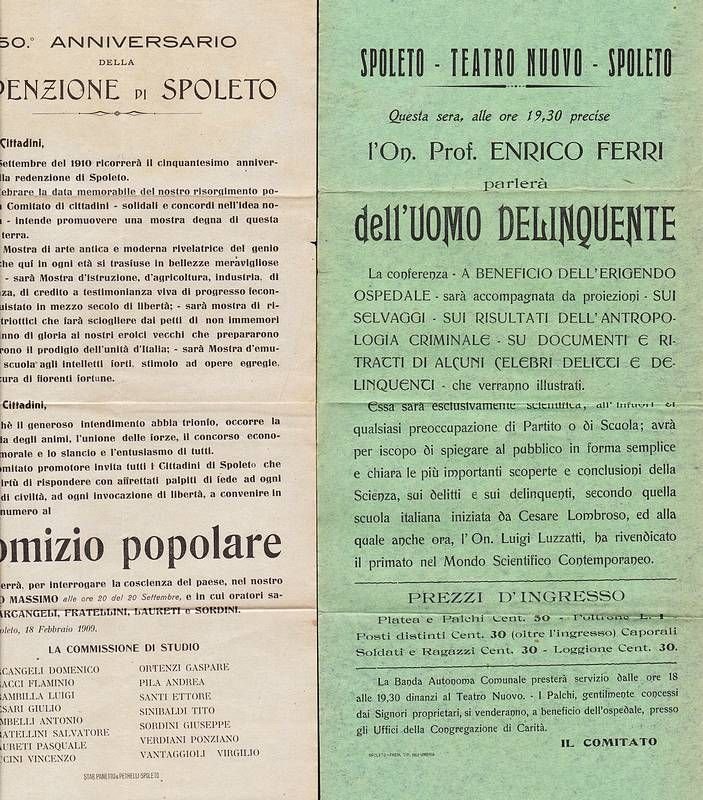 La locandina della 'Nave', cm. 42x20,5 e datata 1909. - La locandina della conferenza sull'Uomo delinquente, cm. 35x17. (senza data, 1909-1910). Altra locandina, cm. 34x16,5. - 50° anniversario della Redenzione di Spoleto, 1909. Segni di piegatura ma ottima conservazione.