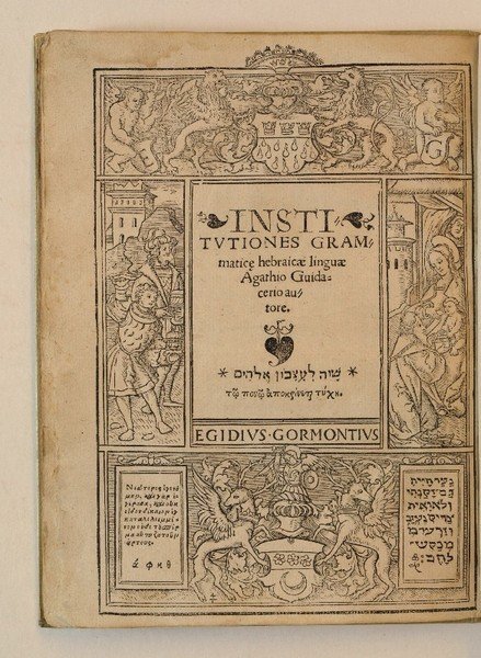 4to. 36 unnumbered ff. With broad figural woodcut title border, a figural woodcut initial, and a large woodcut vignette on last leaf verso. Modern vellum. Very rare second edition of this Hebrew grammar, written in Latin by the Italian orientalist Agatho Guidacerio from Rocca-Coragio in Calabria (1477-1542?). As was the first edition, this revision is dedicated to his patron Leo X (Giovanni Medici). - Year of printing in Greek. A few pencil markings and contemporary ms. marginalia and notes. Inner margin slightly waterstained throughout; the unclothed torso of the female figure in the printer’s device on the last leaf has been contemporarily obscured in ink. - Extremely rare; no copy established in libraries internationally or in the past 30 years’ trade. - Jewish Encyclopedia (in JBA S45, 21f.). Hoefer, NBG XXII, 537. Cf. Michaud, Biogr. Univ. XVIII, 100. Cf. Jöcher Suppl. I, 295 (cites Paris, 1537 as 1st ed.). Cf. Fürst I, 346 (Paris, 1539). Cf. Steinschneider I, 1022, 5167 (Paris, 1540). Not in BM-STC French. Not in Adams. For printer’s device and title border cf. Renouard, Marques typogr. Paris, 384.