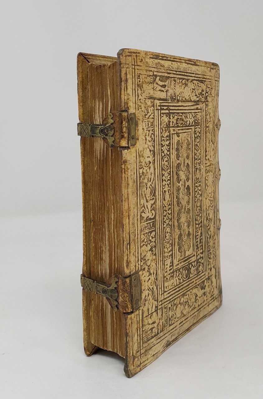 >in-8 (mm 150x105), ff. 160, (16, di cui ultimi 2 bianchi conservati), magnifica legatura coeva in pelle di scrofa su assicelle lignee con impresse a secco raffigurazioni allegoriche di Fede Speranza e Carità e al centro del piatto anteriore monogramma “IHS” e iscrizione in lettere capitali “Societatis Iesu Lucernae”, terminazioni angolari con teste di putti, al centro del piatto posteriore, invece, elementi vegetali e testine di profilo. Seconda edizione aumentata e corretta (posteriore di un anno alla prima di Venezia), di quello che è considerato il primo tentativo di esposizione sistematica della materia canonistica. Il volume diviso in quattro libri, essenzialmente compilato con fini didattici, è opera del giureconsulto canonista Marc'Antonio Cucchi professore a Pavia nel XVI secolo.